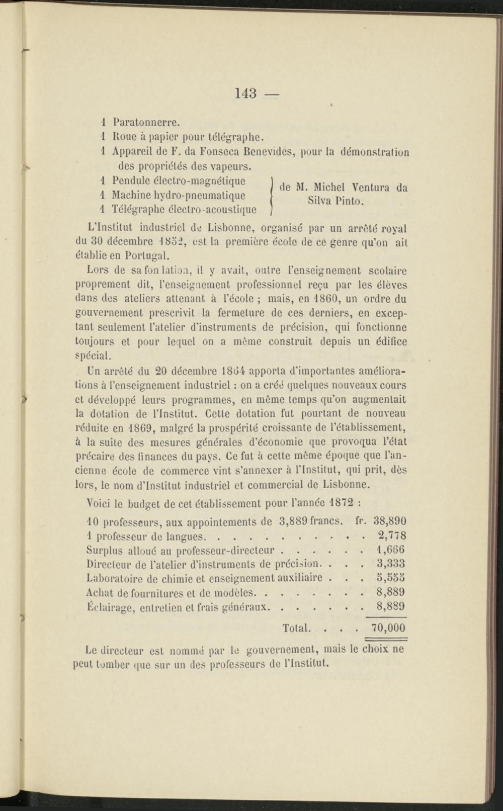 Un arrêté du 20 décembre 1864 apporta dimportantes améliora­tions à lenseignement industriel : on a créé quelques nouveaux cours et développé leurs programmes, en même temps quon augmentait la dotation de lInstitut. Cette dotation fut pourtant de nouveau réduite en 1869, malgré la prospérité croissante de létablissement, à la suite des mesures générales déconomie que provoqua létat précaire des finances du pays. Ce fut à cette môme époque que lan­cienne école de commerce vint sannexer à lInstitut, qui prit, dès lors, le nom dinstitut industriel et commercial de Lisbonne.
