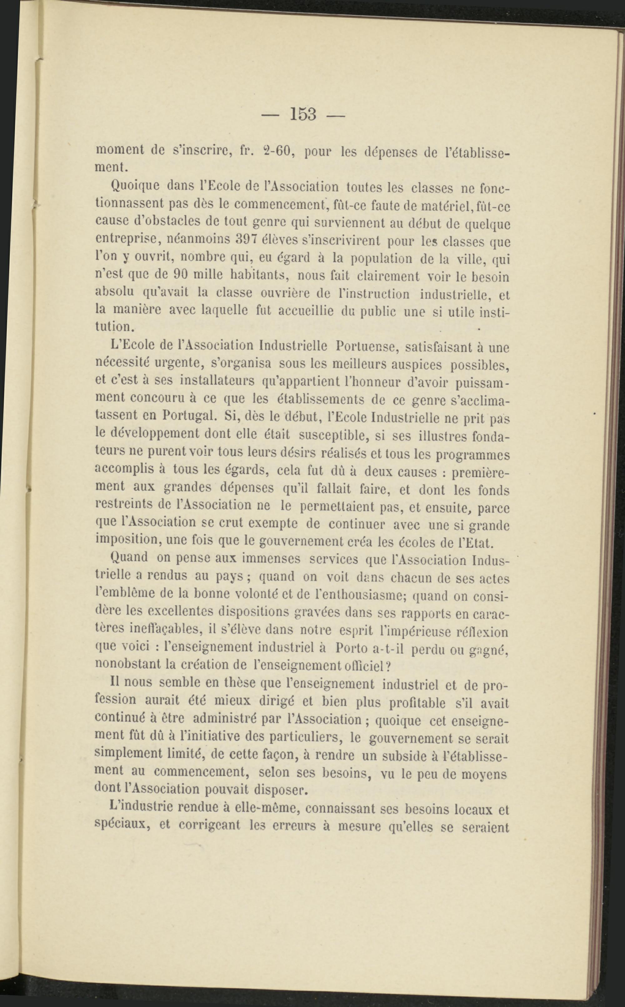 LEcole de lAssociation Industrielle Porluense, satisfaisant à une nécessité urgente, sorganisa sous les meilleurs auspices possibles, et cest à ses installateurs quappartient lhonneur davoir puissam­ment concouru à ce que les établissements de ce genre sacclima­tassent en Portugal. Si, dès le début, lEcole Industrielle ne prit pas le développement dont elle était susceptible, si ses illustres fonda­teurs ne purent voir tous leurs désirs réalisés et tous les programmes accomplis à tous les égards, cela fut à deux causes : première­ment aux grandes dépenses quil fallait faire, et dont les fonds restreints de lAssociation ne le permettaient pas, et ensuite, parce que l'Association se crut exempte de continuer avec une si grande imposition, une fois que le gouvernement créa les écoles de lEtat.