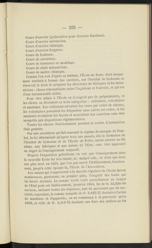 Comme l’on voit d’après ce tableau, l’École de Porto était uniquement destinée à former des ouvriers, car l'Institut de Lisbonne se réservait le droit de préparer les directeurs de fabriques et les mécaniciens : classe intermédiaire entre l’ingénieur et l’ouvrier, et qui est d’une incontestable utilité.