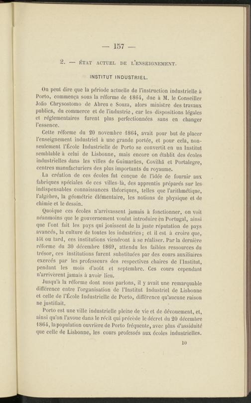 On peut dire que la période actuelle de linstruction industrielle à Porto, commença sous la réforme de 4864, due à M. le Conseiller Joâo Chrysoslomo de Abreu e Souza, alors ministre des travaux publics, du commerce et de lindustrie, car les dispositions légales et réglementaires furent plus perfectionnées sans en changer lessence.