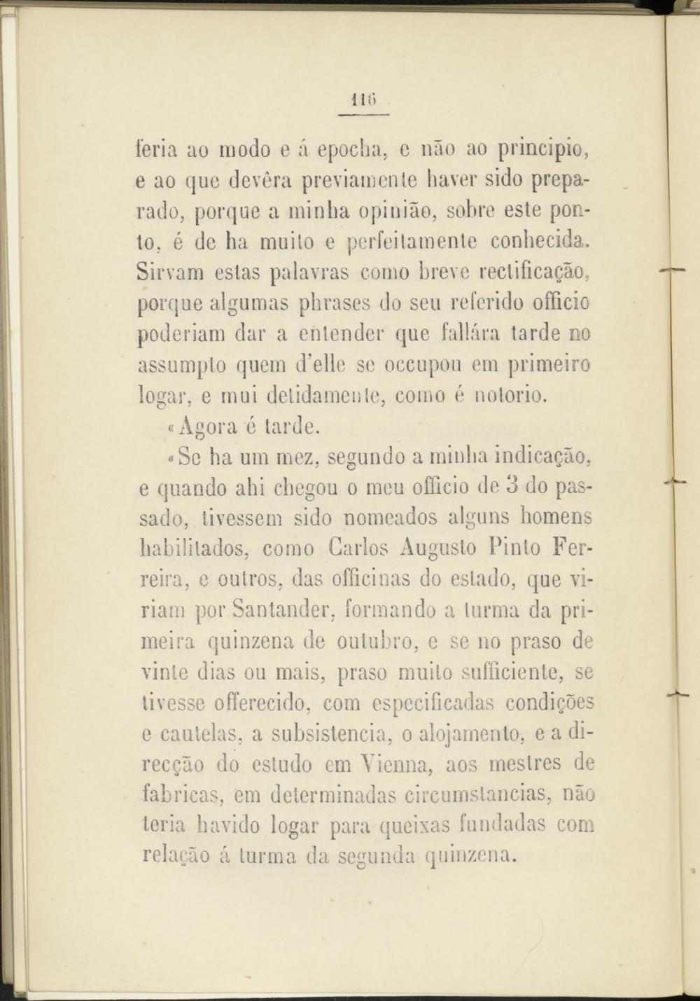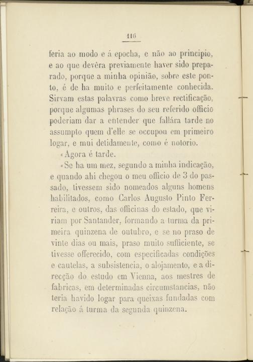 «Se ha um mez, segundo a minlia indicacáo, e quando abi ebegou o meu ofücio de 3 do pas- sado, livessem sido nomeados alguns homens habilitados, como Garlos Augusto Pinto Fer- reira, e outros, das ofíicinas do estado, que vi- riam por Santander, formando a lumia da pri- meira quinzena de outuhro, e se no praso de vinle dias ou mais, praso milito sufíicienlc, se tivesse offerecido, com especificadas condigoes e cautelas, a subsistencia, o alojamiento, e a di- reccáo do estudo em Vienna, aos mestres de fabricas, em determinadas circumslancias, nao teria bavido logar para queixas fundadas com relacao á turma da segunda quinzena.