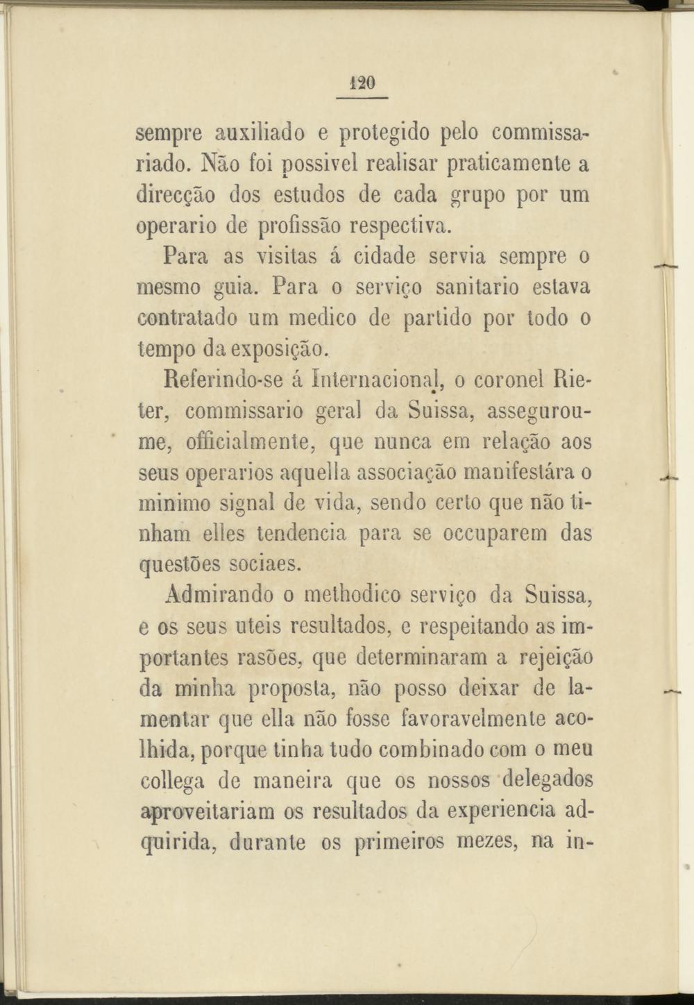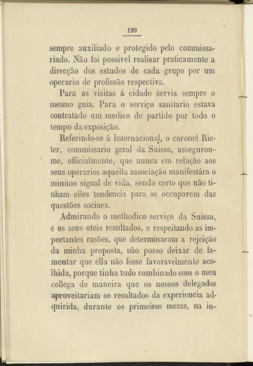 Referindo-se á Internacional, o coronel Rie- ter, commissario geral da Suissa, assegurou- me, officialmente, que nunca em relagao aos seus operarios aquella associac-áo manifestara o minimo signal de vida, sendo certo que nao ti- nham elles tendencia para se occuparem das questoes sociaes.