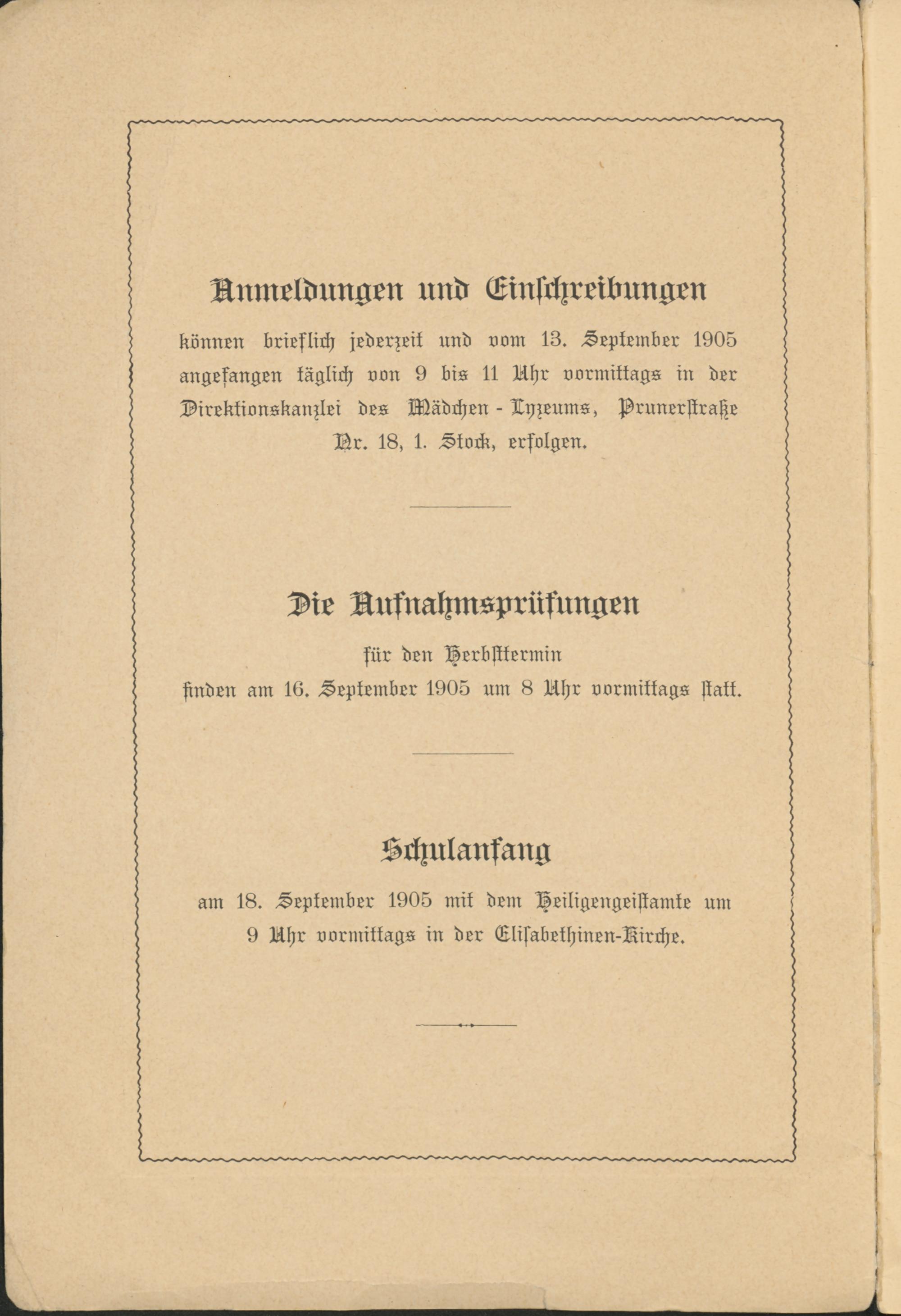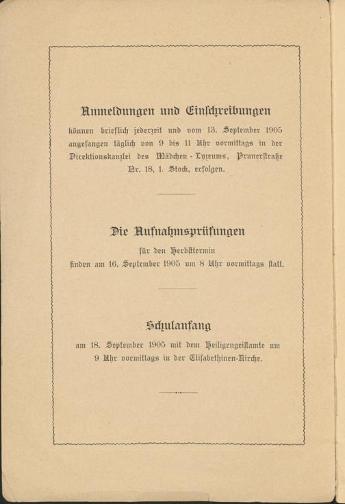 Können brieflich jederzeit und vorn 13. September 1905 angefangen täglich von 9 bis 11 Uhr vormittags in der Direktionskanzlei des Mädchen - Lyzeums, Prunerstrafie Nr. 18, 1. Stock, erfolgen.