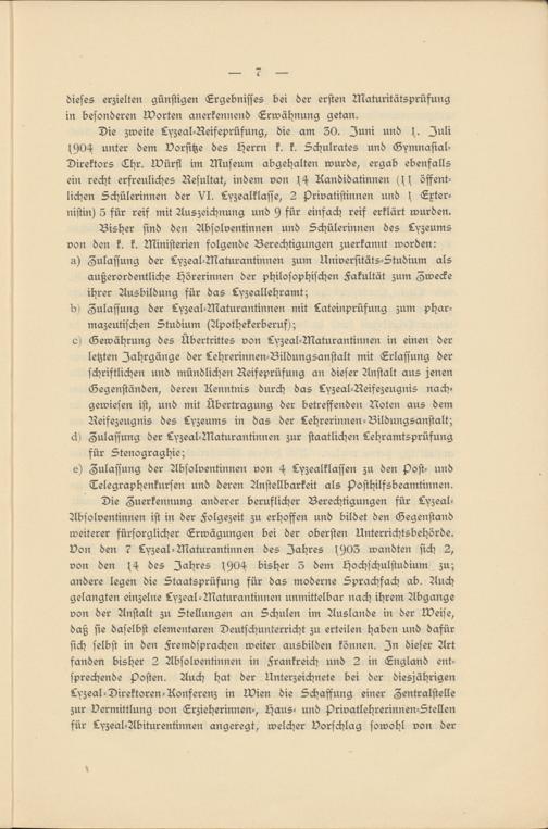 Bisher sind den Absolventinnen und Schülerinnen des Lyzeums von den k. k. Ministerien folgende Berechtigungen zuerkannt worden: a) Zulassung der Lyzeal-Maturantinnen zum Universitäts-Studium als außerordentliche Hörerinnen der philosophischen Fakultät zum Zwecke ihrer Ausbildung für das Lyzeallehramt;