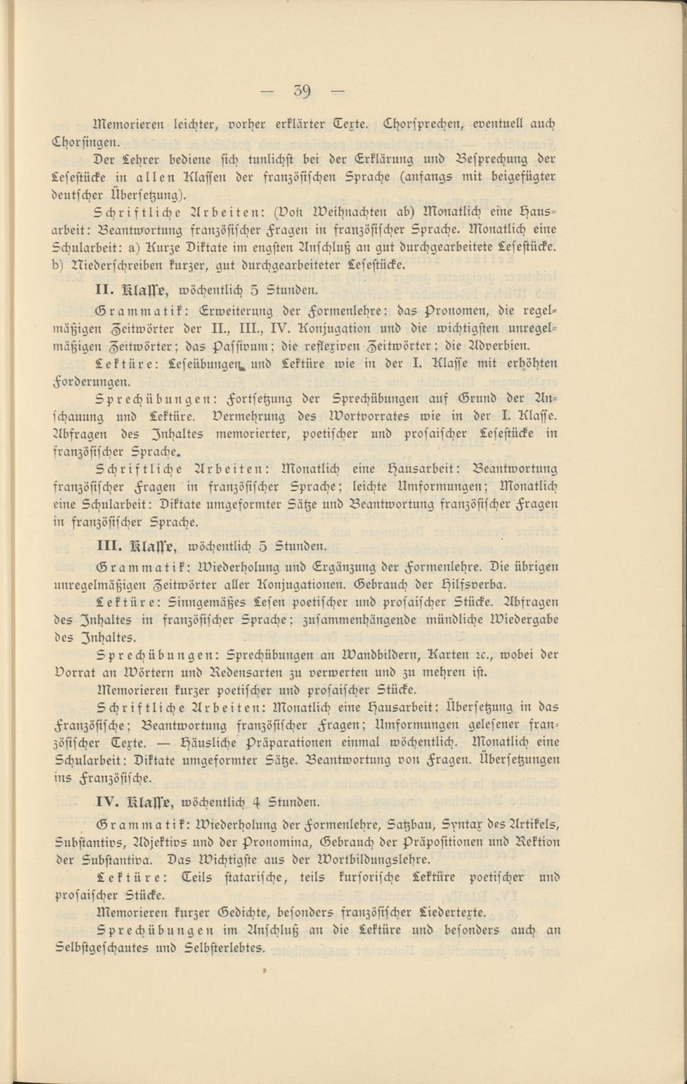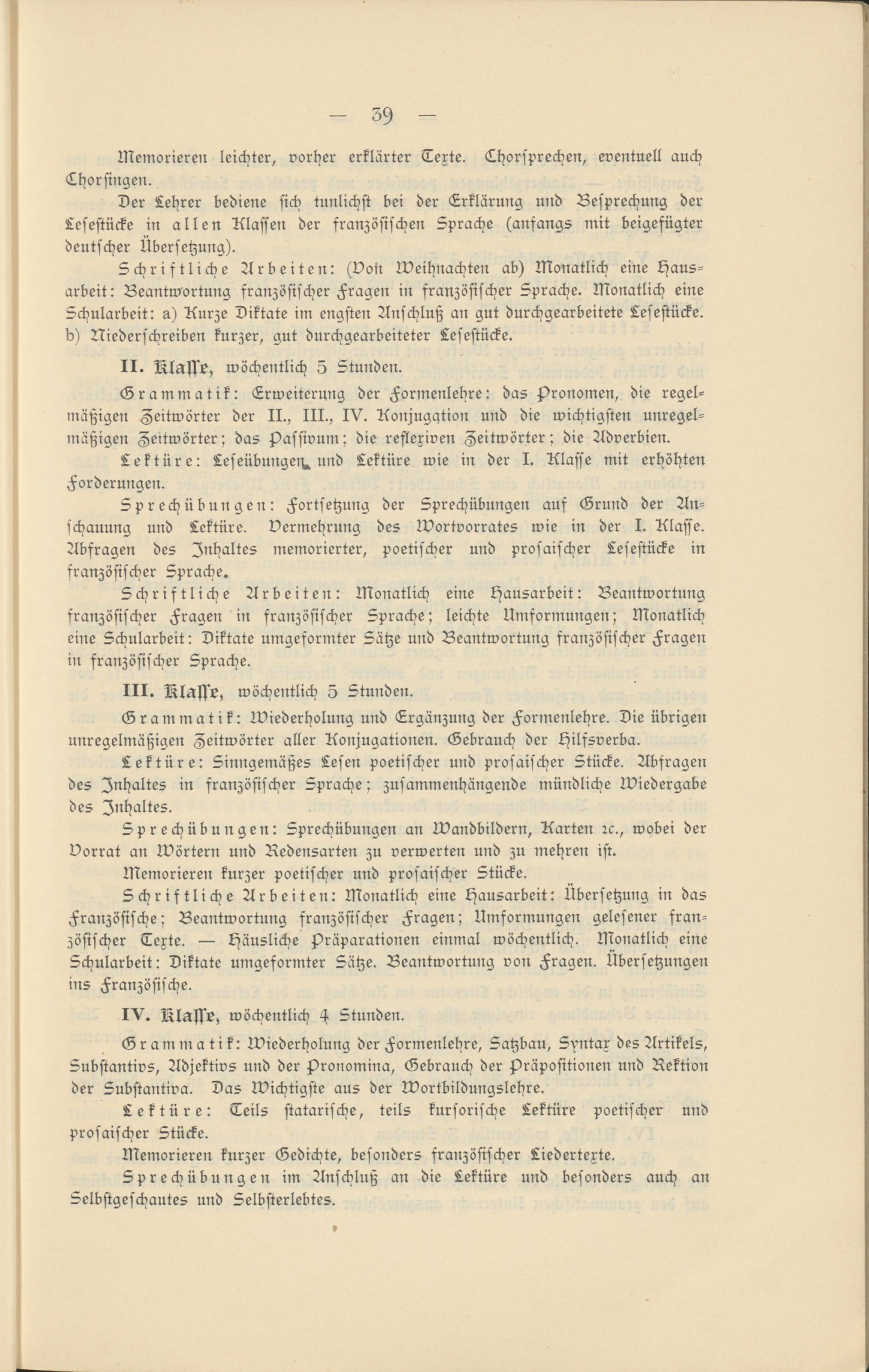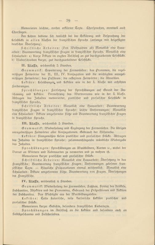 Sprechübungen: Fortsetzung der Sprechübungen auf Grund der Anschauung und Lektüre. Vermehrung des Wortvorrates wie in der I. Klasse. Abfragen des Inhaltes memorierter, poetischer und prosaischer Lesestücke in französischer Sprache.
