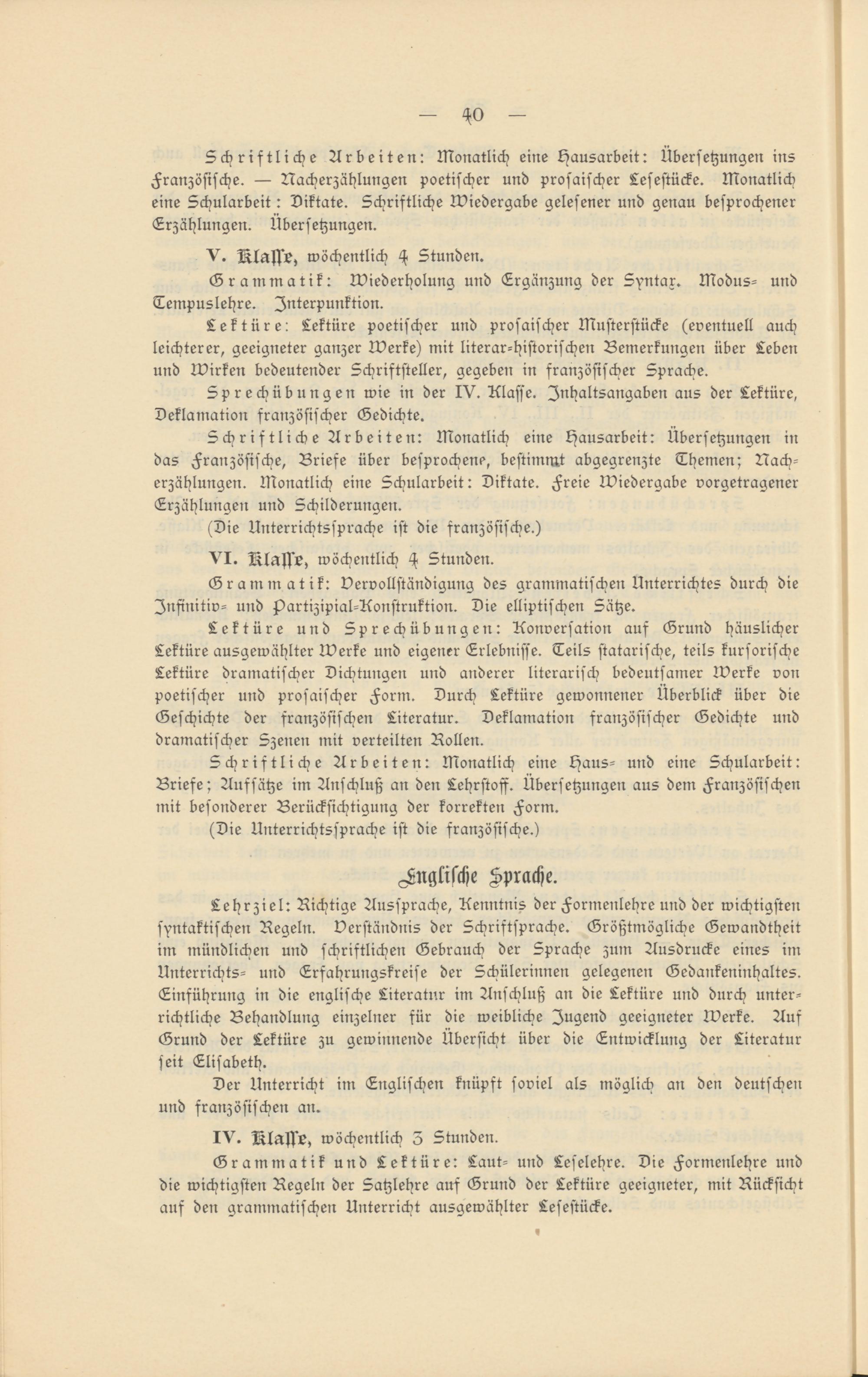 Lehrziel: Richtige Aussprache, Kenntnis der Formenlehre und der wichtigsten syntaktischen Regeln. Verständnis der Schriftsprache. Größtmögliche Gewandtheit im mündlichen und schriftlichen Gebrauch der Sprache zum Ausdrucke eines im Unterrichts- und Lrsahrungskreise der Schülerinnen gelegenen Gedankeninhaltes. Einführung in die englische Literatur im Anschluß an die Lektüre und durch unter- richtliche Behandlung einzelner für die weibliche Jugend geeigneter Werke. Aus Grund der Lektüre zu gewinnende Übersicht über die Entwicklung der Literatur seit Elisabeth.