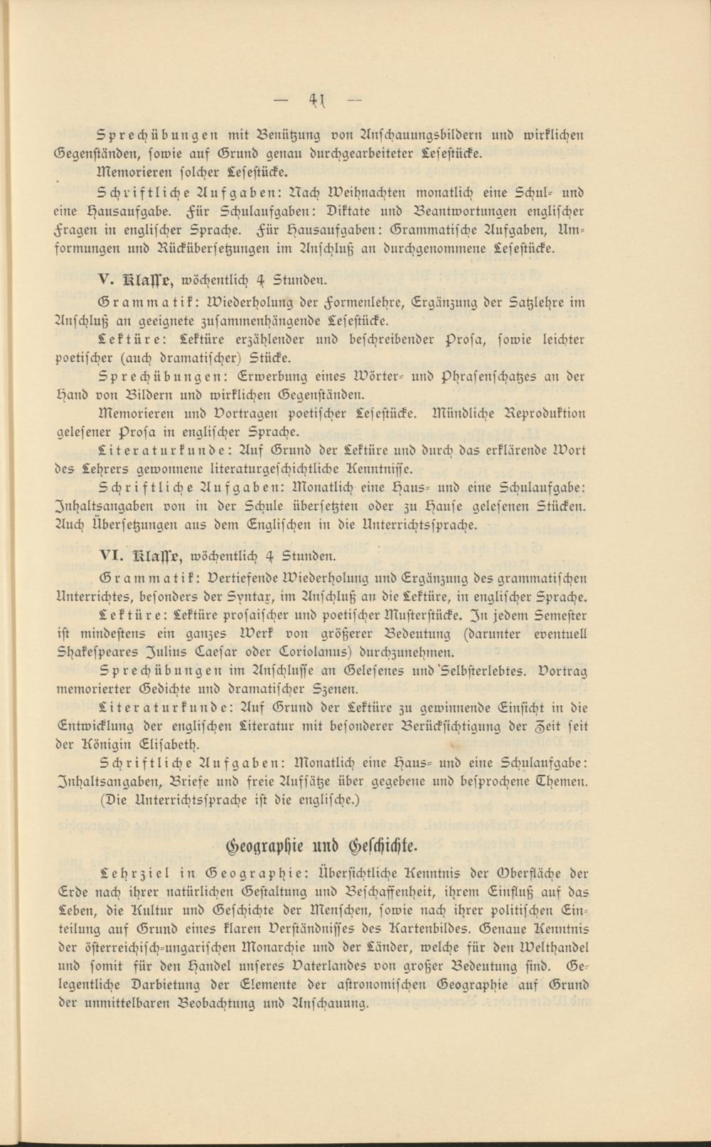 Lehrziel in Geographie: Übersichtliche Kenntnis der (Oberfläche der Erde nach ihrer natürlichen Gestaltung und Beschaffenheit, ihrem Einfluß aus das Leben, die Kultur und Geschichte der Menschen, sowie nach ihrer politischen Einteilung aus Grund eines klaren Verständnisses des Kartenbildes. Genaue Kenntnis der österreichisch-ungarischen Monarchie und der Länder, welche für den Welthandel und somit für den Handel unseres Vaterlandes von großer Bedeutung sind. Gelegentliche Darbietung der Elemente der astronomischen Geographie aus Grund der unmittelbaren Beobachtung und Anschauung.