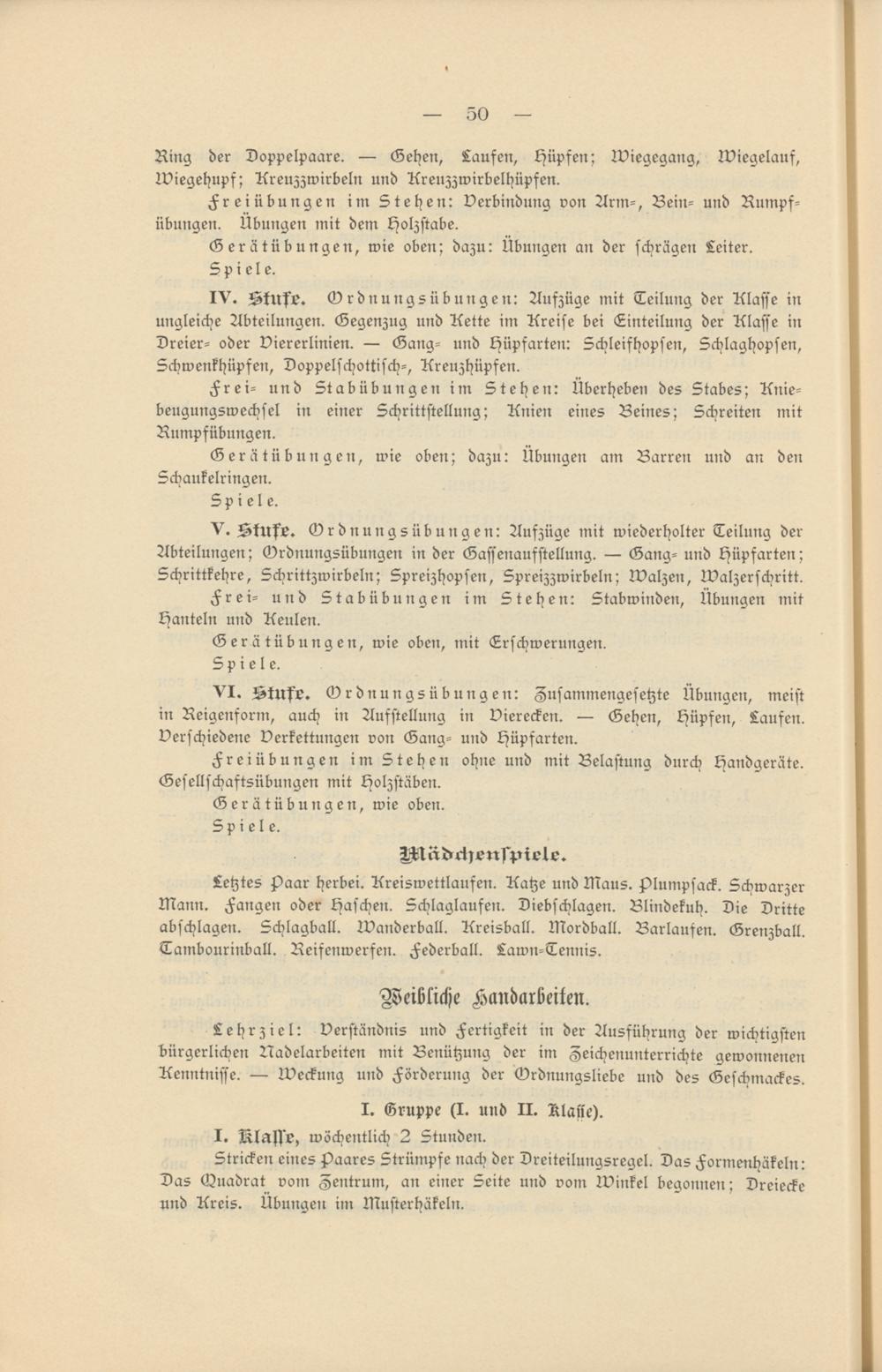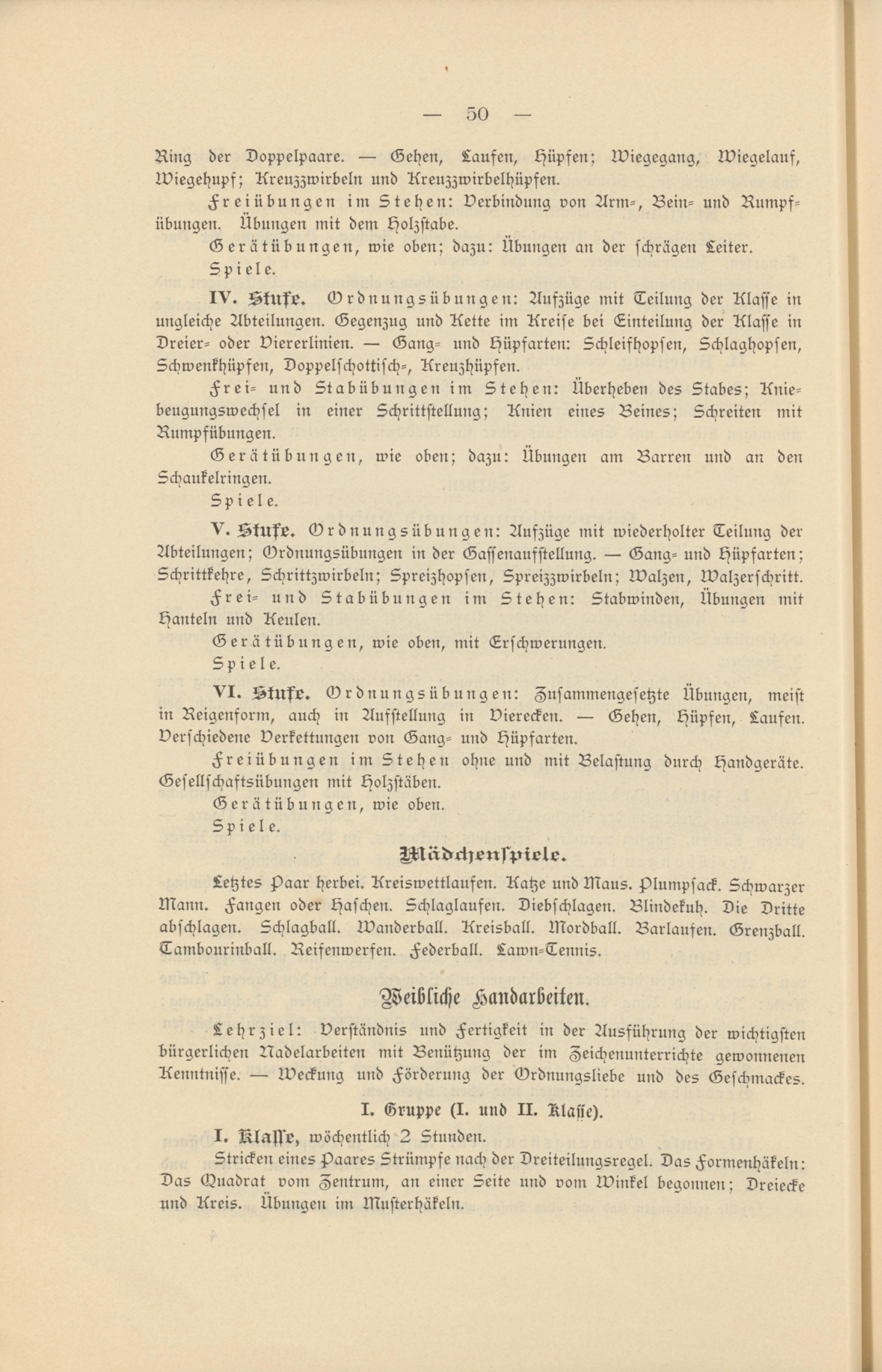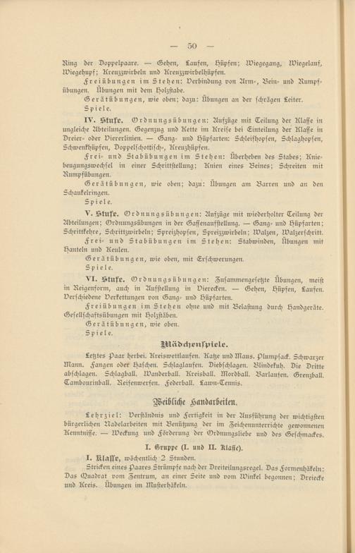 IV. Stufe. Ordnungsübungen: Aufzüge mit Teilung der Klasse in ungleiche Abteilungen. Gegenzug und Kette im Kreise bei Einteilung der Klasse in Dreier- oder Viererlinien. — Gang- und Hüpfarten: Schleifhopfen, Schlaghopsen, Schwenkhüpsen, Doppelschottisch-, Kreuzhüpfen.