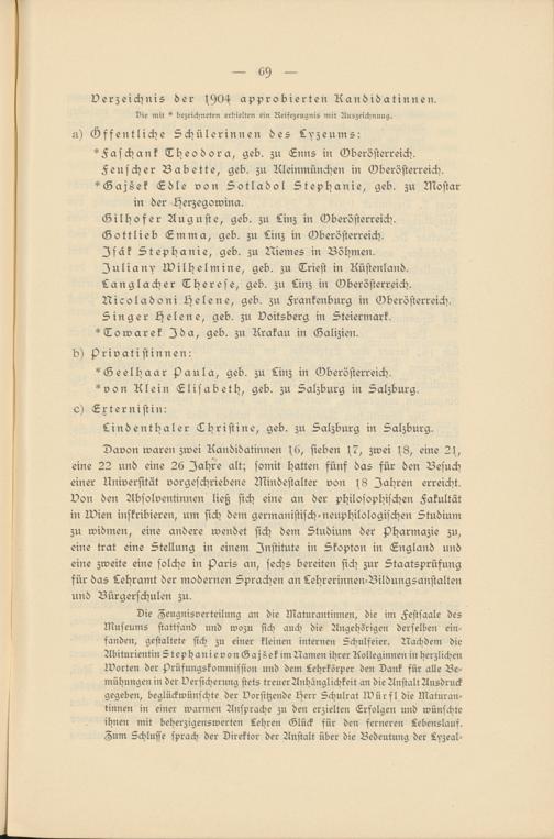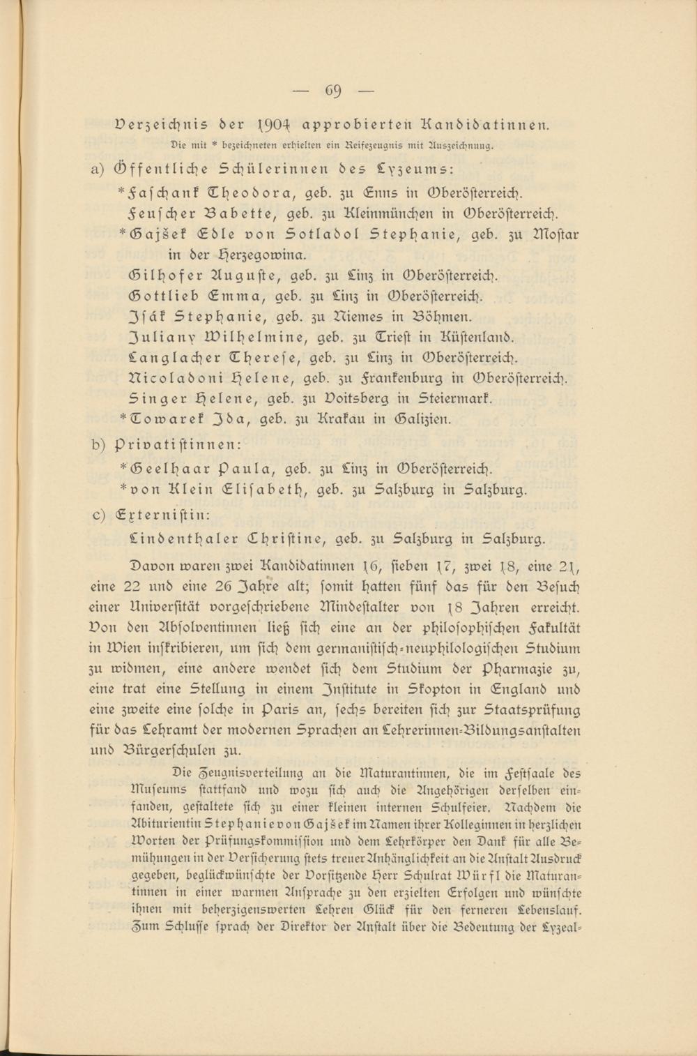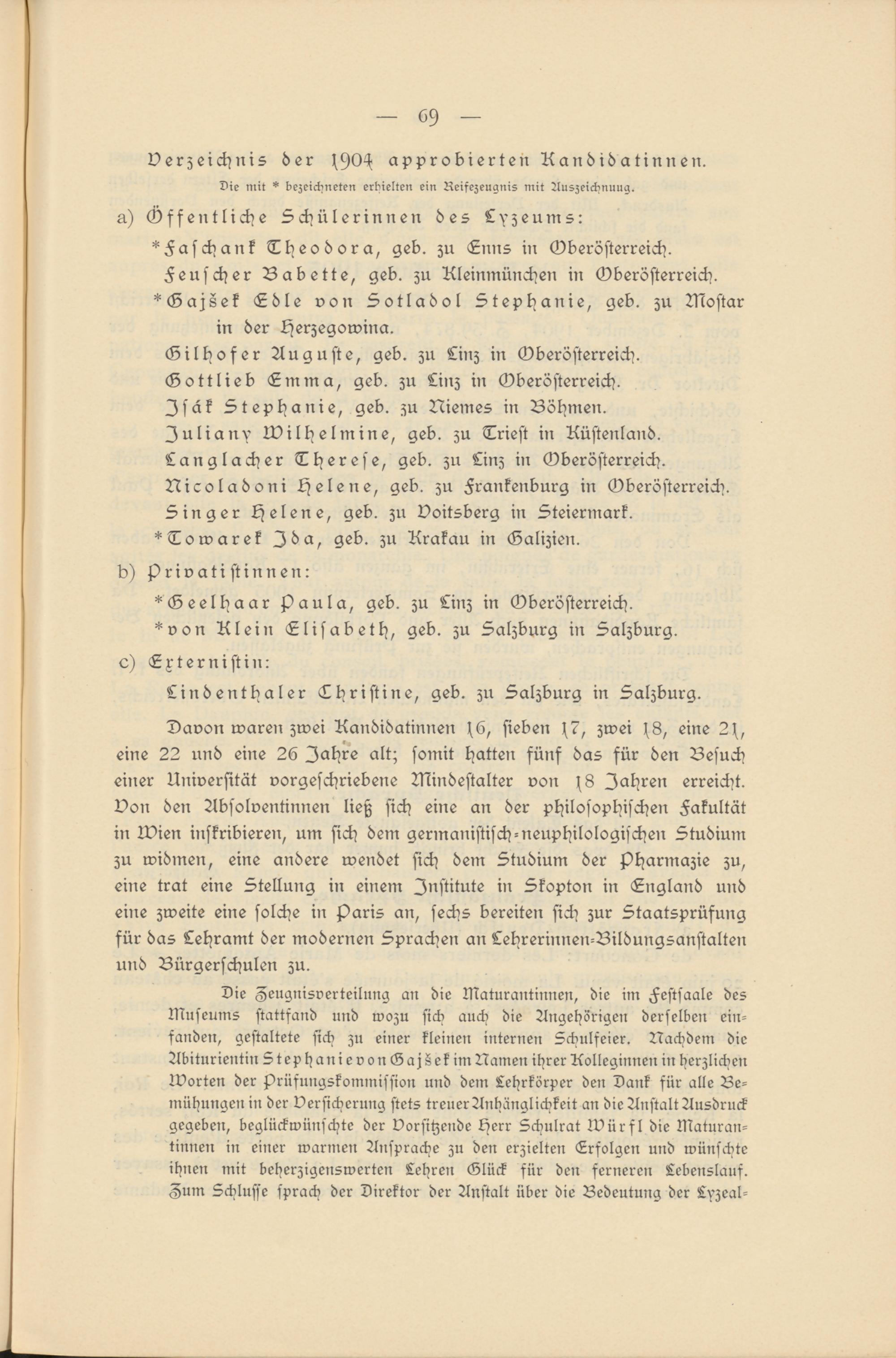 Davon waren zwei Kandidatinnen s6, sieben s7, zwei s8, eine 2s, eine 22 und eine 26 Jahre alt; somit hatten fünf das für den Besuch einer Universität vorgeschriebene UKndestalter von s8 Jahren erreicht, von den Absolventinnen ließ sich eine an der philosophischen Fakultät in Ivien inskribieren, um sich dem germanistisch-neuphilologischen Studium zu widmen, eine andere wendet sich dem Studium der pharmazie zu, eine trat eine Stellung in einem Institute in Skopton in England und eine zweite eine solche in Paris an, sechs bereiten sich zur Staatsprüfung für das Lehramt der modernen Sprachen an Lehrerinnen-Bildungsanstalten und Bürgerschulen zu.