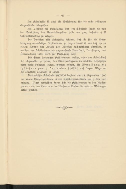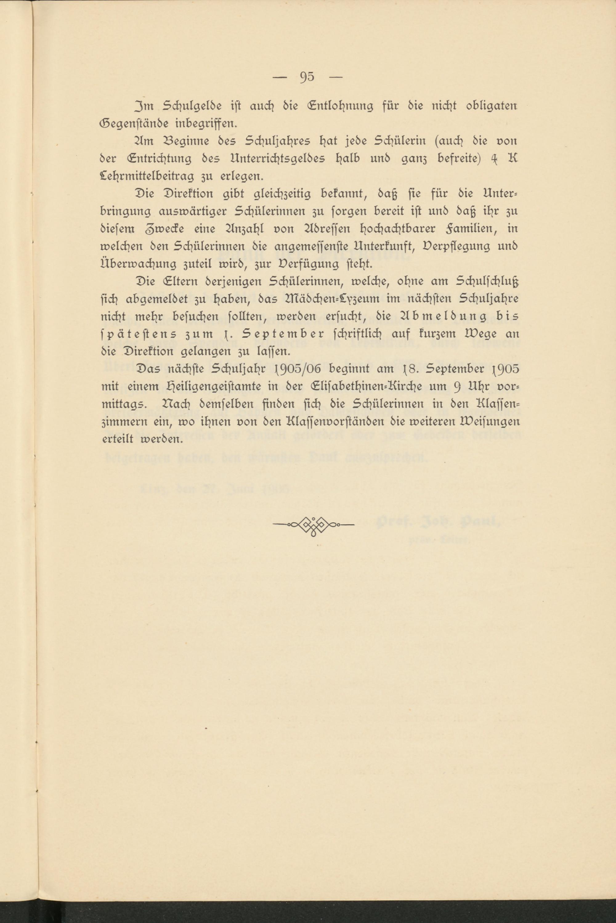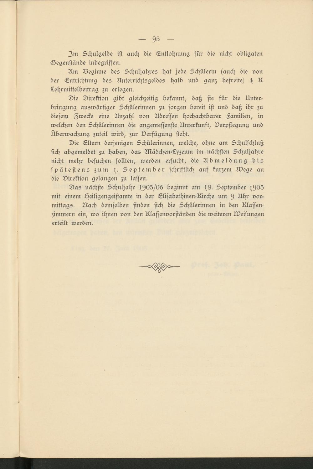 Das nächste Schuljahr f905/06 beginnt am s8. September f905 mit einem Heiligengeistamte in der Elisabethinen-Uirche um 9 Uhr vor­mittags. Nach demselben finden sich die Schülerinnen in den Klassen­zimmern ein, wo ihnen von den Rlassenvorständen die weiteren Weisungen erteilt werden.