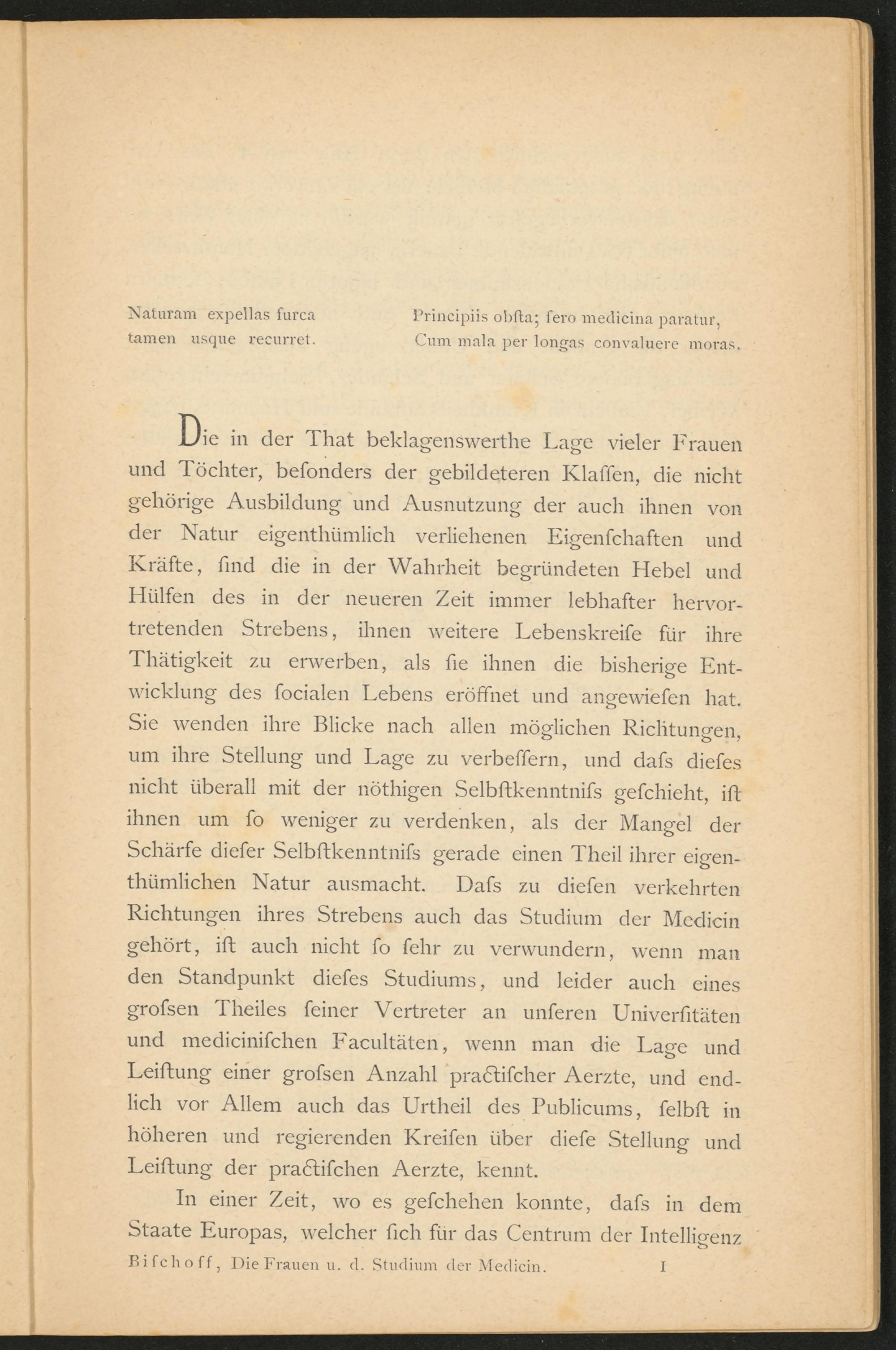 Die in der That beklagenswerthe Lage vieler Frauen und Töchter, befonders der gebildeteren Klaffen, die nicht gehörige Ausbildung und Ausnutzung der auch ihnen von der Natur eigenthtimlich verliehenen Eigenfchaften und Kräfte, find die in der Wahrheit begründeten Hebel und Hülfen des in der neueren Zeit immer lebhafter hervortretenden Strebens, ihnen weitere Lebenskreife für ihre Thätigkeit zu erwerben, als fie ihnen die bisherige Entwicklung des focialen Lebens eröffnet und angewiefen hat. Sie wenden ihre Blicke nach allen möglichen Richtungen, um ihre Stellung und Lage zu verbeffern, und dafs diefes nicht überall mit der nothigen Selbftkenntnifs gefchieht, ift ihnen um fo weniger zu verdenken, als der Mangel der Schärfe diefer Selbftkenntnifs gerade einen Theil ihrer eigen- thümlichen Natur ausmacht. Dafs zu diefen verkehrten Richtungen ihres Strebens auch das Studium der Medicin gehört, ift auch nicht fo fehr zu verwundern, wenn man den Standpunkt diefes Studiums, und leider auch eines grofsen Theiles feiner Vertreter an unferen Univerfitäten und medicinifchen Facultäten, wenn man die Lage und Leiftung einer grofsen Anzahl pra6tifcher Aerzte, und endlich vor Allem auch das Urtheil des Publicums, felbft in höheren und regierenden Kreifen über diefe Stellung und Leiftung der praötifchen Aerzte, kennt.