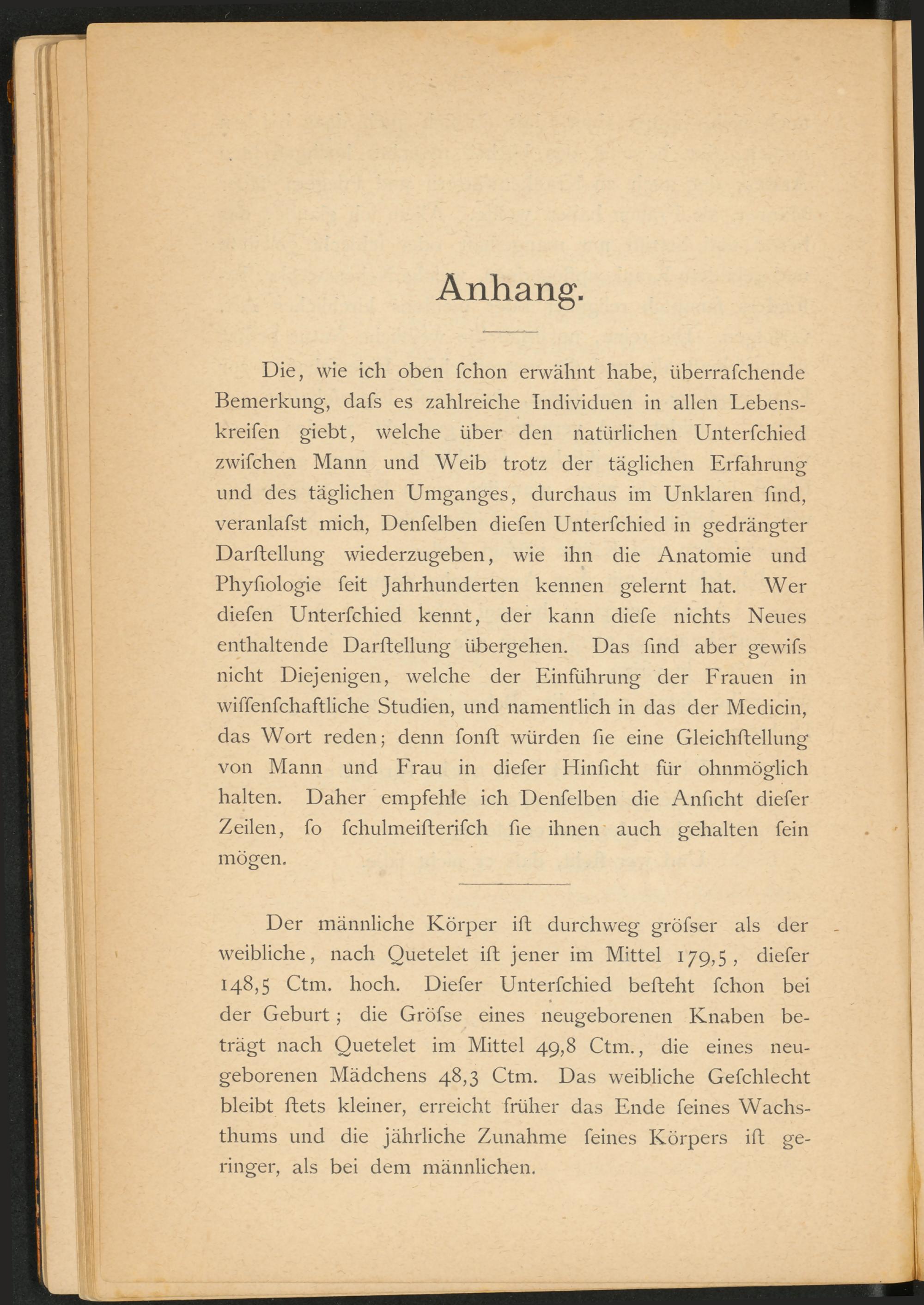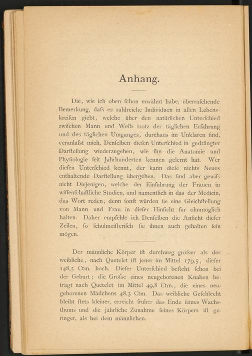 Die, wie ich oben fchon erwähnt habe, überrafchende Bemerkung, dafs es zahlreiche Individuen in allen Lebens- kreifen giebt, welche über den natürlichen Unterfchied zwifchen Mann und Weib trotz der täglichen Erfahrung und des täglichen Umganges, durchaus im Unklaren find, veranlafst mich, Denfelben diefen Unterfchied in gedrängter Darftellung wiederzugeben, wie ihn die Anatomie und Phyfiologie feit Jahrhunderten kennen gelernt hat. Wer diefen Unterfchied kennt, der kann diefe nichts Neues enthaltende Darftellung übergehen. Das find aber gewifs nicht Diejenigen, welche der Einführung der Frauen in wiffenfchaftliche Studien, und namentlich in das der Medicin, das Wort reden; denn fonft würden fie eine Gleichftellung von Mann und Frau in diefer Hinficht für ohnmöglich halten. Daher empfehle ich Denfelben die Anficht diefer Zeilen, fo fchulmeifterifch fie ihnen auch gehalten fein mögen.