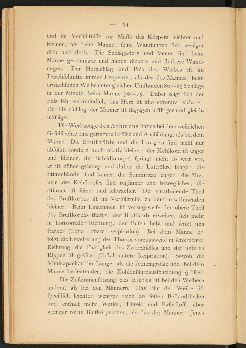 Die Werkzeuge desAthmens haben bei dem weiblichen Gefchlechte eine geringere Gröfse und Ausbildung, als bei dem Manne. Die Brufthöhle und die Lungen find nicht nur abfolut, fondern auch relativ kleiner; der Kehlkopf ift enger und kleiner, der Schildknorpel fpringt nicht fo weit vor, er ift höher gehängt und daher die Luftröhre länger; die Stimmbänder find kürzer, die Stimmritze enger, die Muskeln des Kehlkopfes find regfamer und beweglicher, die Stimme ift feiner und fchwächer. Der einathmende Theil des Bruftkorbes ift im Verhältniffe zu dem ausathmenden kleiner. Beim Einathmen ift vorzugsweife der obere Theil des Bruftkorbes thätig, der Bruftkorb erweitert fich mehr in horizontaler Richtung, der Bufen hebt und fenkt fich ftärker (Coftal obere Refpiration). Bei dem Manne erfolgt die Erweiterung des Thorax vorzugsweife in fenkrechter Richtung, die Thätigkeit des Zwerchfelles und der unteren Rippen ift gröfser (Coftal untere Refpiration). Sowohl die Vitalcapacität der Lunge, als die Athemgröfse find bei dem Manne bedeutender, die Kohlenfäureausfcheidung gröfser.