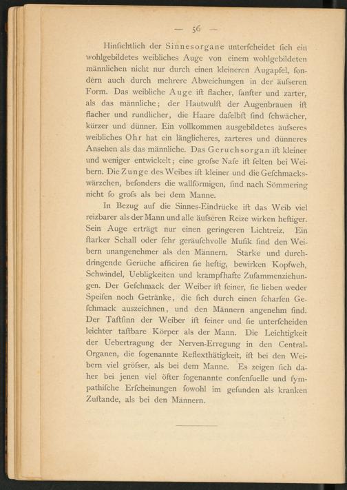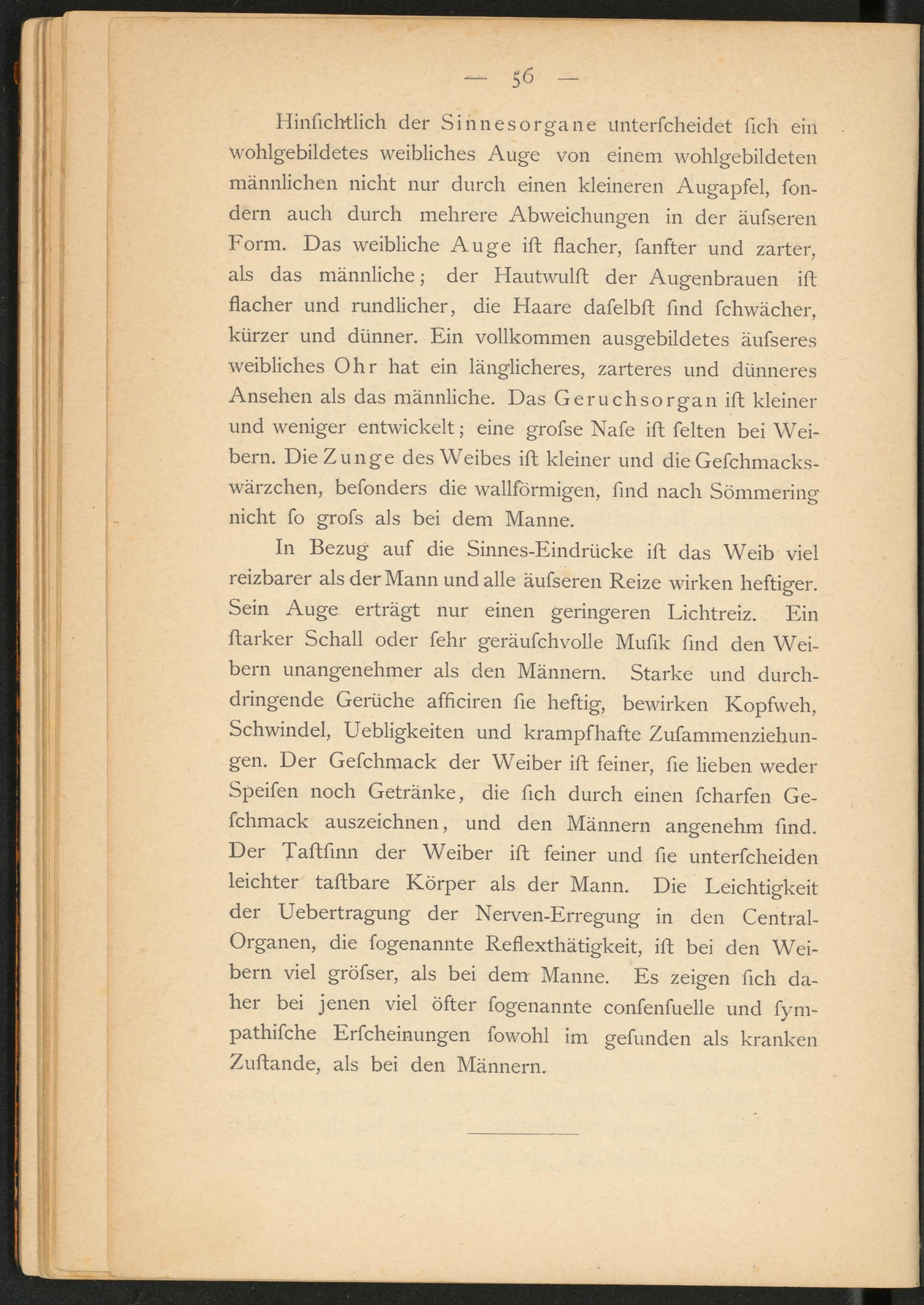 In Bezug auf die Sinnes-Eindrücke ift das Weib viel reizbarer als der Mann und alle äufseren Reize wirken heftiger. Sein Auge erträgt nur einen geringeren Lichtreiz. Ein ftarker Schall oder fehr geräufchvolle Mufik find den Weibern unangenehmer als den Männern. Starke und durchdringende Gerüche afficiren fie heftig, bewirken Kopfweh, Schwindel, Uebligkeiten und krampfhafte Zufammenziehun- gen. Der Gefchmack der Weiber ift feiner, fie lieben weder Speifen noch Getränke, die fleh durch einen fcharfen Gefchmack auszeichnen, und den Männern angenehm find. Der Taftflnn der Weiber ift feiner und fie unterfcheiden leichter taftbare Körper als der Mann. Die Leichtigkeit der Uebertragung der Nerven-Erregung in den Central- Organen, die fogenannte Reflexthätigkeit, ift bei den Weibern viel gröfser, als bei dem Manne. Es zeigen fleh daher bei jenen viel öfter fogenannte confenfuelle und fym- pathifche Erfcheinungen fowohl im gefunden als kranken Zuftande, als bei den Männern.
