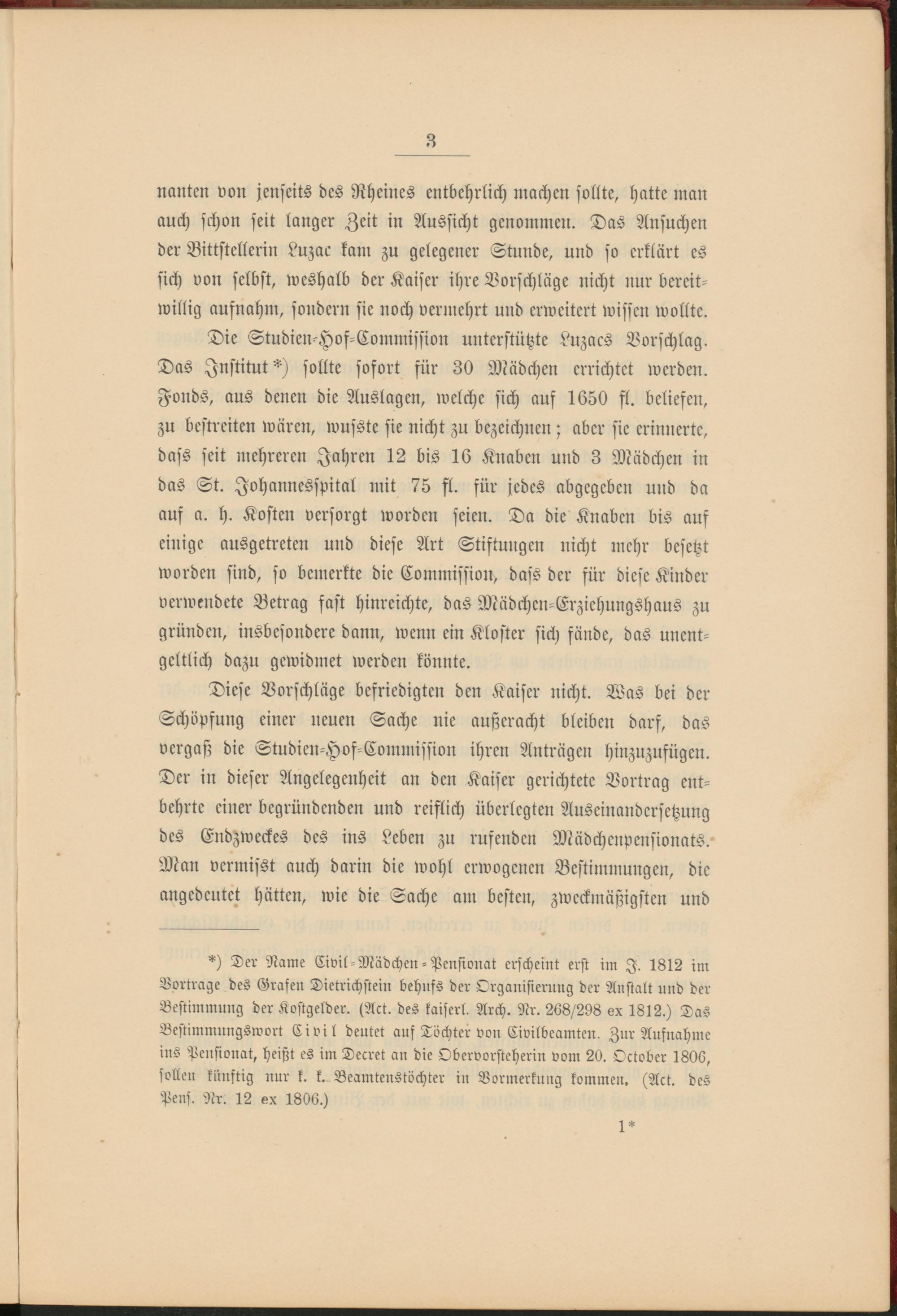 *) Der Name Civil-Mädchen-Pensionat erscheint erst im I. 1812 im Bortrage des Grafen Dietrichstein behufs der Organisierung der Anstalt und der Bestimmung der Kostgelder. (Act. des kaiserl. Arch. Nr. 268/298 ox 1812.) Das Bestimmungswort Civil deutet auf Töchter von Civilbeamten. Zur Aufnahme ins Pensionat, heißt es im Decret an die Obervorsteherin vorn 20. October 1806, sollen künftig nur k. k. Beamtenstöchter in Vormerkung kommen. (Act. des Penf. Nr. 12 ex 1806.)