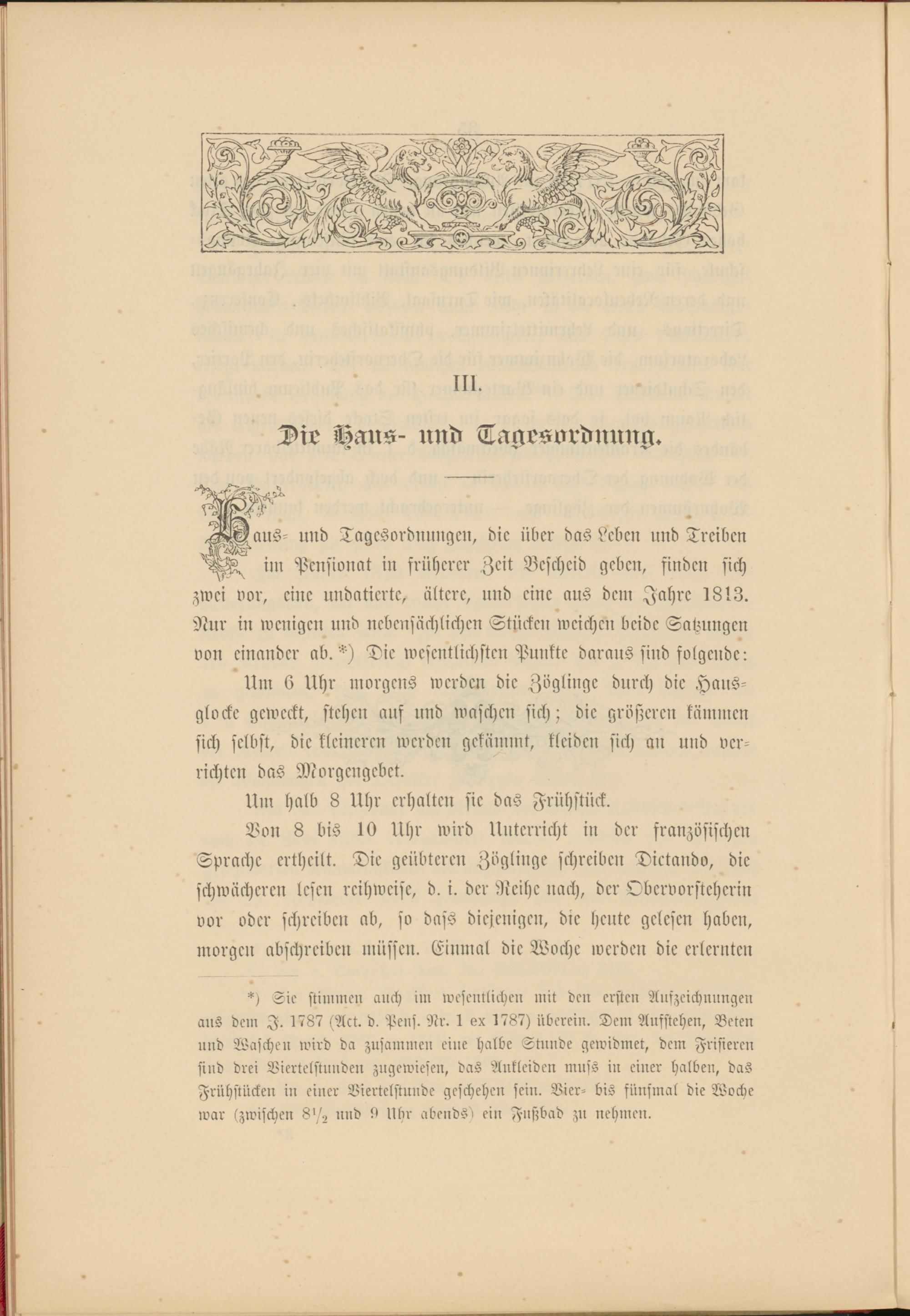 *) Sie stimmen auch im wesemlichen mit den ersten Aufzeichnungen aus dem I. 1787 (Act. d. Pens. Nr. 1 ex 1787) überein. Dem Aufstehen, Beten und Waschen wird da zusammen eine halbe Stunde gewidmet, dem Frisieren sind drei Viertelstunden zugewiesen, das Ankleiden muss in einer halben, das Frühstücken in einer Viertelstunde geschehen sein. Vier- bis fünfmal die Woche war (zwischen 8'/, und 9 Uhr abendsl ein Fnstbad zu nehmen.