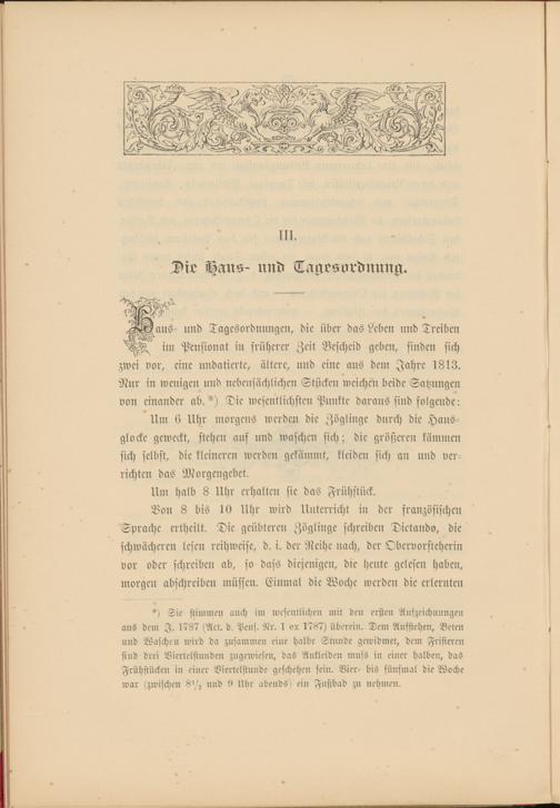 aus- und Tagesordnungen, die über das Leben und Treiben ^ in: Pensionat in früherer Zeit Bescheid geben, finden sich zwei vor, eine undatierte, ältere, und eine aus den: Jahre 1813. Nur in wenigen und nebensächlichen Stücken weichen beide Satzungen von einander ab. *) Die wesentlichsten Punkte daraus sind folgende: