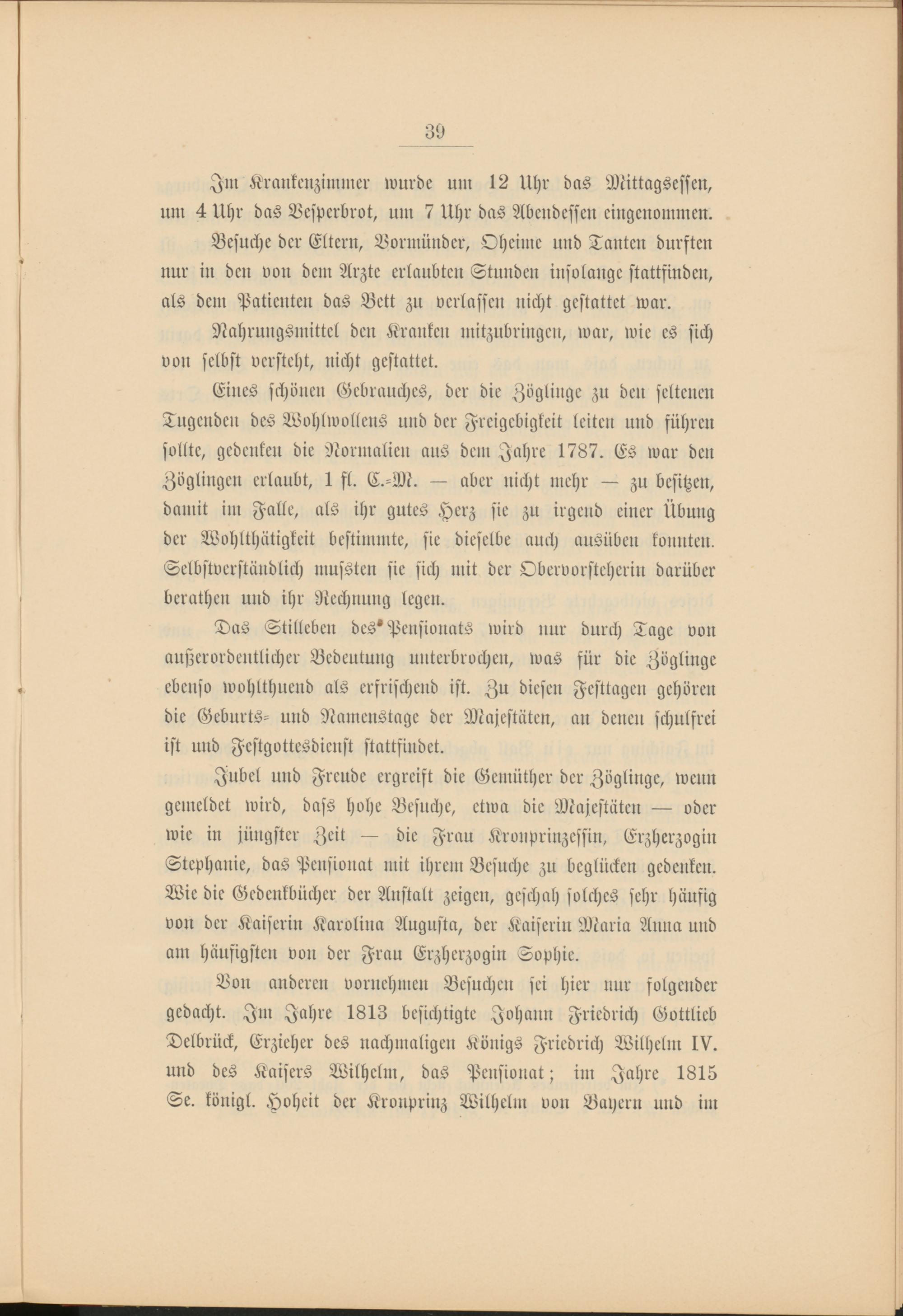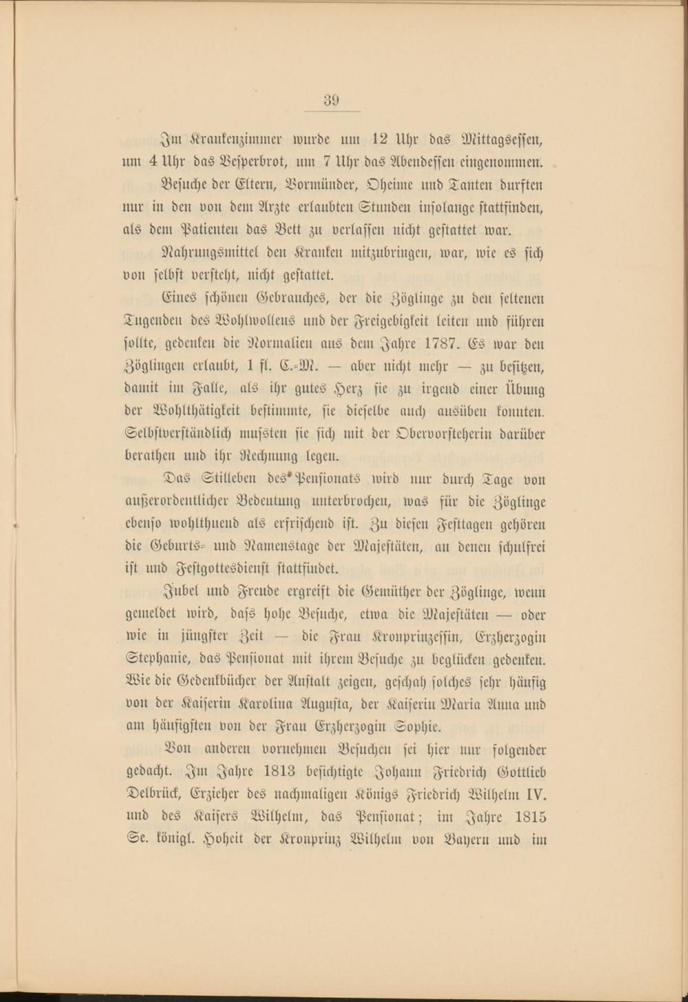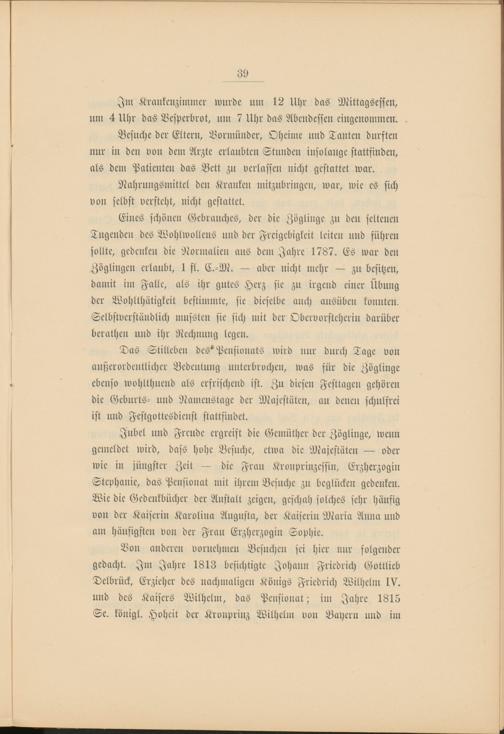 Jubel und Freude ergreift die Gemüther der Zöglinge, wenn gemeldet wird, dass hohe Besuche, etwa die Majestäten — oder wie in jüngster Zeit — die Frau Kronprinzessin, Erzherzogin Stephanie, das Pensionat mit ihrem Besuche zu beglücken gedenken. Wie die Gedenkbücher der Anstalt zeigen, geschah solches sehr häufig von der Kaiserin Karolina Augusta, der Kaiserin Maria Anna und am häufigsten von der Frau Erzherzogin Sophie.