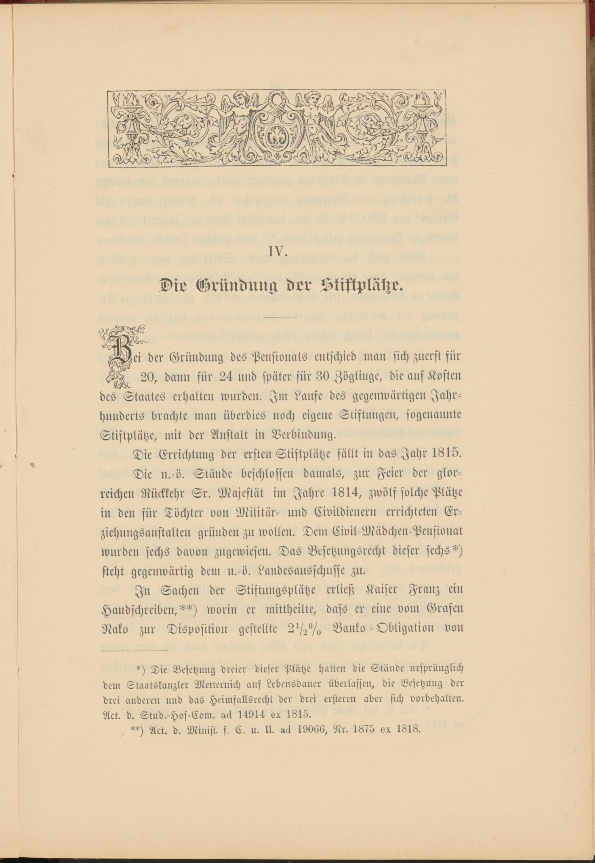 Die n.-ö. Stände beschlossen damals, zur Feier der glor­reichen Rückkehr Sr. Majestät im Jahre 1814, zwölf solche Plätze in den für Töchter von Militär- und Cioildiencrn errichteten Er­ziehungsanstalten gründen zu wollen. Dem Civil Mädchen Pensionat wurden sechs davon zugewiesen. Das Besetznngsrecht dieser sechs'*) steht gegenwärtig dem n.-ö. Landesausschnsse zu.
