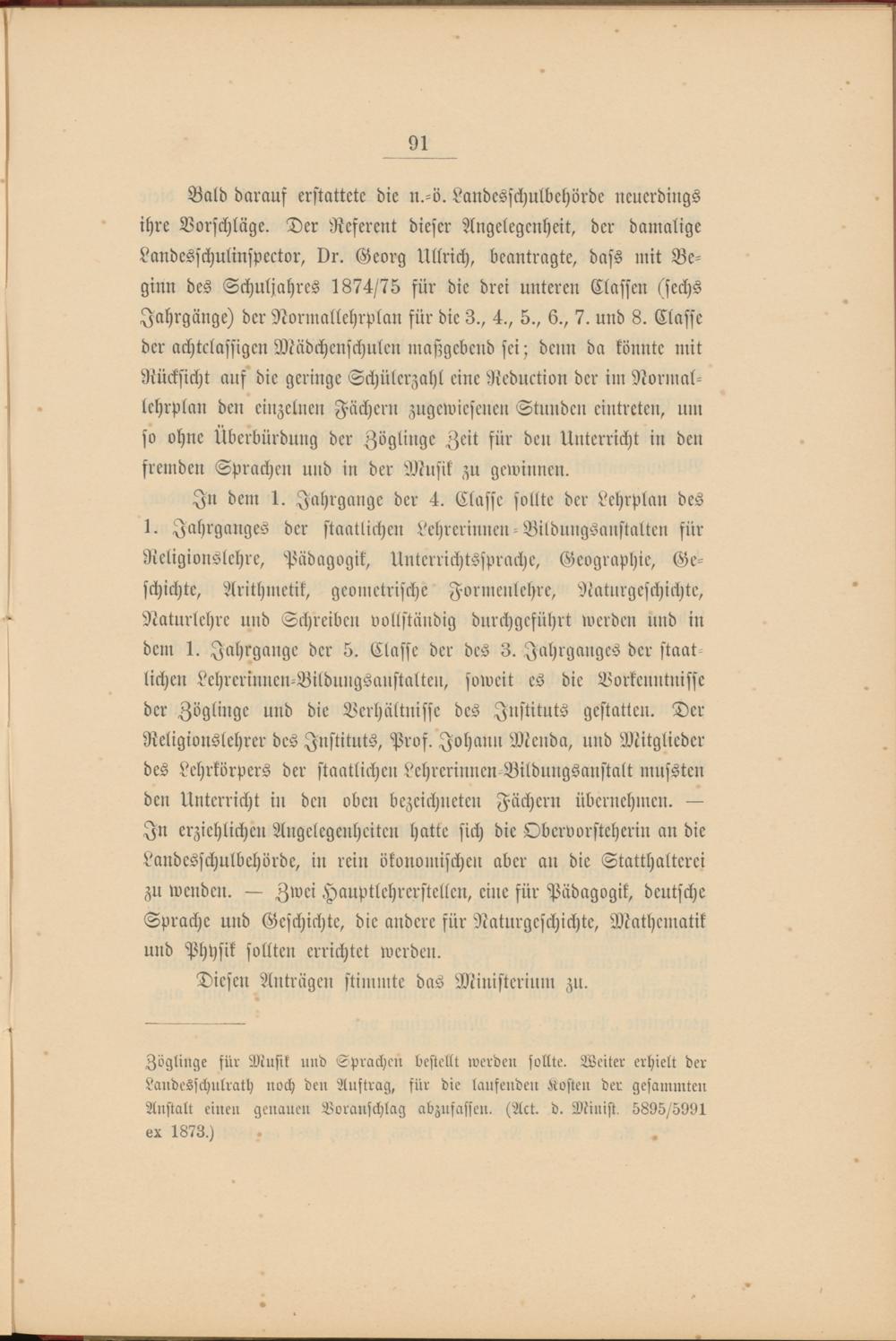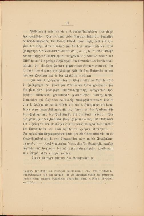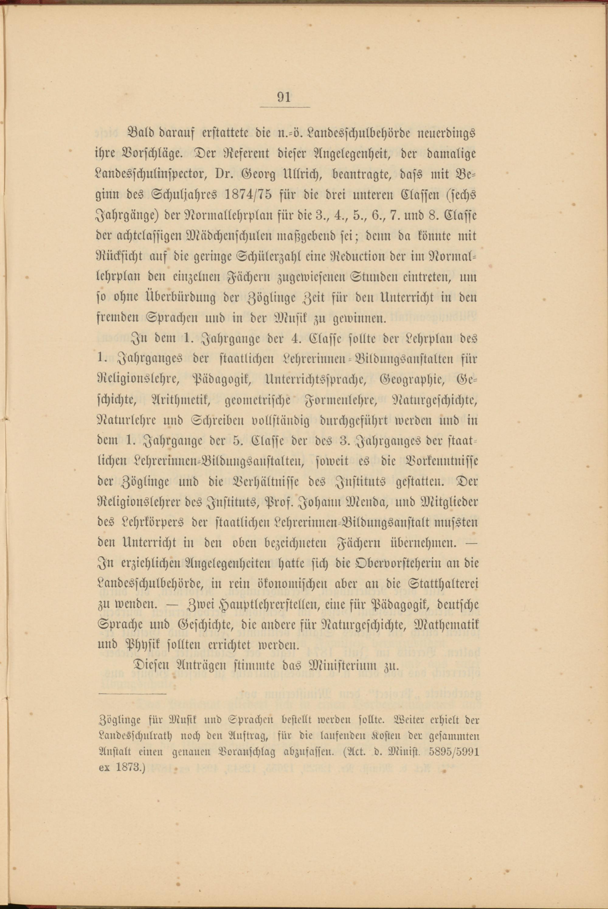 Bald darauf erstattete die n.-ö. Landesschulbehörde neuerdings ihre Vorschläge. Der Referent dieser Angelegenheit, der damalige Landesfchulinspector, Dr. Georg Ullrich, beantragte, dass mit Beginn des Schuljahres 1874/75 für die drei unteren Classen (sechs Jahrgänge) der Normallehrplan für die 3., 4., 5., 6., 7. und 8. Classe der achtclassigen Mädchenschulen maßgebend sei; denn da könnte mit Rücksicht auf die geringe Schülerzahl eine Reduction der im Normallehrplan den einzelnen Fächern zugewiesenen Stunden eintreten, um so ohne Überbürdung der Zöglinge Zeit für den Unterricht in den fremden Sprachen und in der Musik zu gewinnen.
