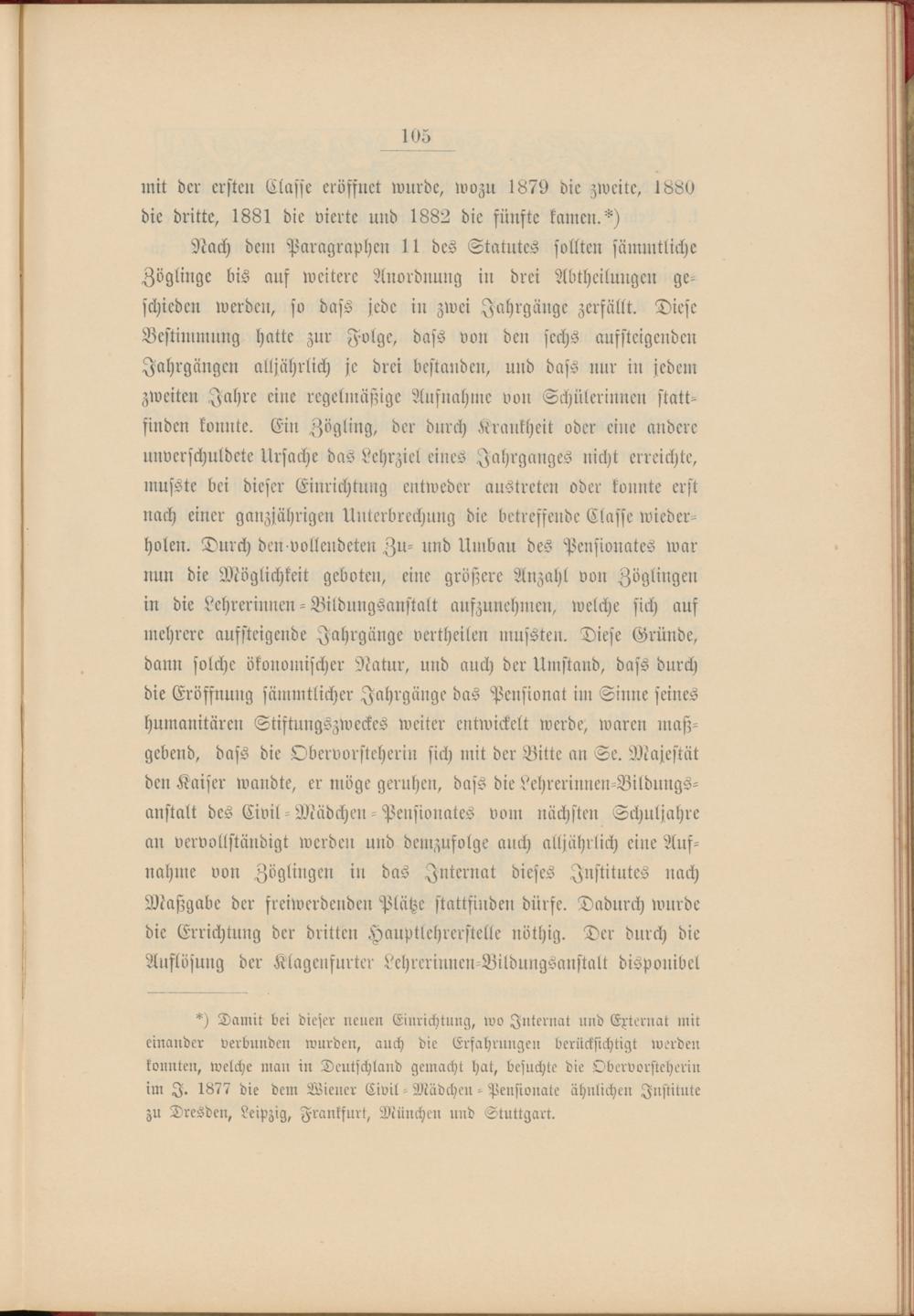 *) Damit bei dieser neuen Einrichtung, wo Internat und Epternat mit einander verbunden wurden, auch die Erfahrungen berücksichtigt werden konnten, welche man in Deutschland gemacht hat, besuchte die Obervorsteherin im I. 1877 die dem Wiener Civil - Mädchen - Pensionate ähnlichen Institute zu Dresden, Leipzig, Frankfurt, München und Stuttgart.