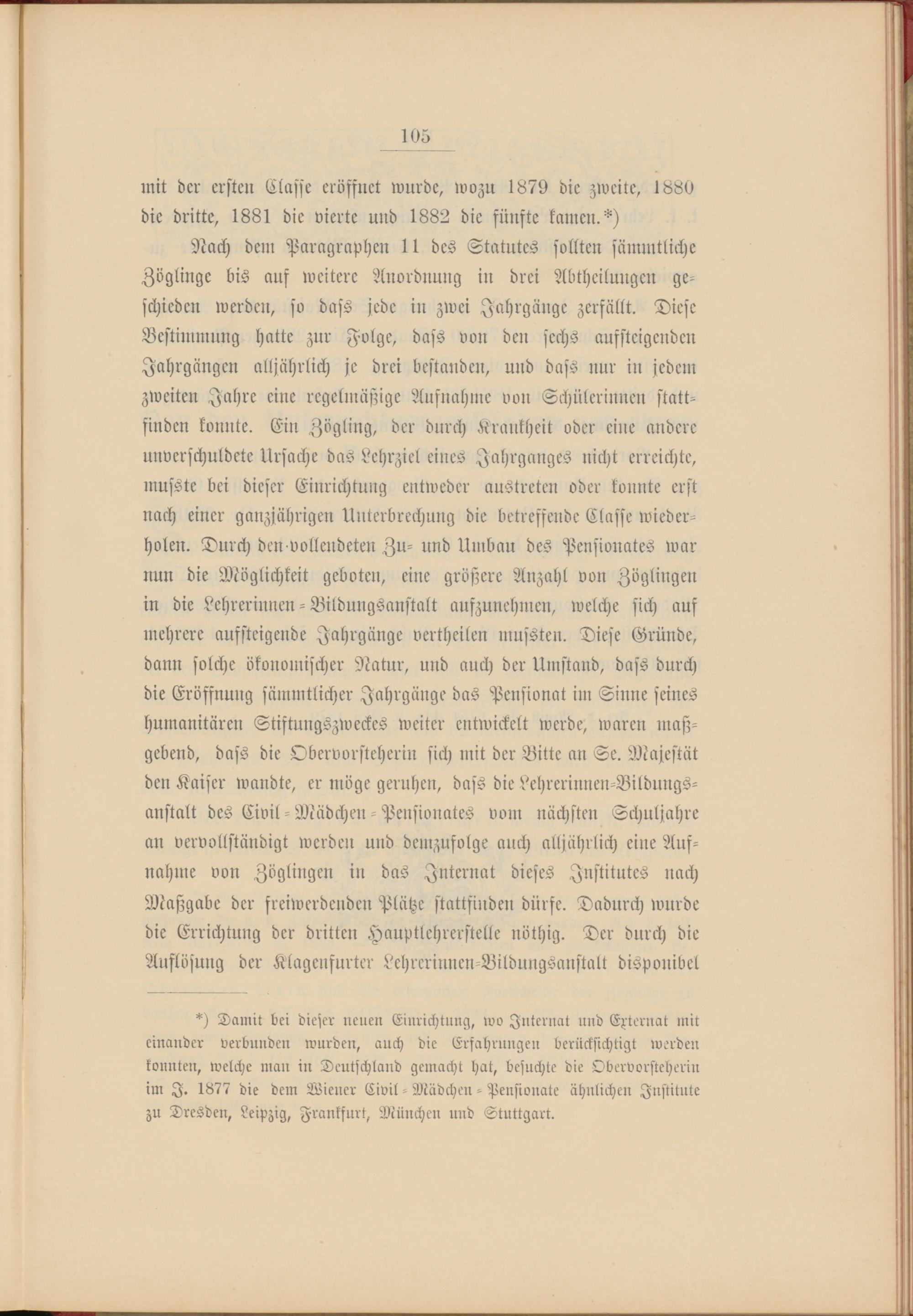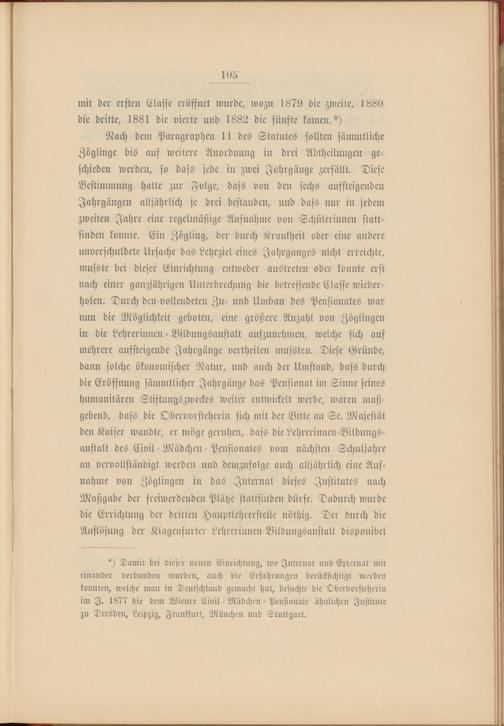 Nach dem Paragraphen 11 des Statutes sollten sämmtliche Zöglinge bis auf weitere Anordnung in drei Abtheilungen ge­schieden werden, so dass jede in zwei Jahrgänge zerfällt. Diese Bestimmung hatte zur Folge, dass von den sechs aufsteigenden Jahrgängen alljährlich je drei bestanden, und dass nur in jedem zweiten Jahre eine regelmäßige Aufnahme von Schülerinnen statt­finden konnte. Ein Zögling, der durch Krankheit oder eine andere unverschuldete Ursache das Lehrziel eines Jahrganges nicht erreichte, musste bei dieser Einrichtung entweder austreten oder konnte erst nach einer ganzjährigen Unterbrechung die betreffende Classe wieder­holen. Durch den vollendeten Zu- und Umbau des Pensionates war nun die Möglichkeit geboten, eine größere Anzahl von Zöglingen in die Lehrerinnen - Bildungsanstalt aufzunehmen, welche sich auf mehrere aufsteigende Jahrgänge vertheilen mussten. Diese Gründe, dann solche ökonomischer Natur, und auch der Umstand, dass durch die Eröffnung sämmtlicher Jahrgänge das Pensionat im Sinne seines humanitären Stiftungszweckes weiter entwickelt werde, waren maß­gebend, dass die Obervorsteherin sich mit der Bitte an Se. Majestät den Kaiser wandte, er möge geruhen, dass die Lehrerinnen-Bildungs- anstalt des Civil-Mädchen - Pensionates vom nächsten Schuljahre au vervollständigt werden und demzufolge auch alljährlich eine Auf­nahme von Zöglingen in das Internat dieses Institutes nach Maßgabe der freiwerdenden Plätze stattfinden dürfe. Dadurch wurde die Errichtung der dritten Hauptlehrerstelle nöthig. Der durch die Auflösung der Klagensurter Lehrerinnen-Bildungsanstalt disponibel
