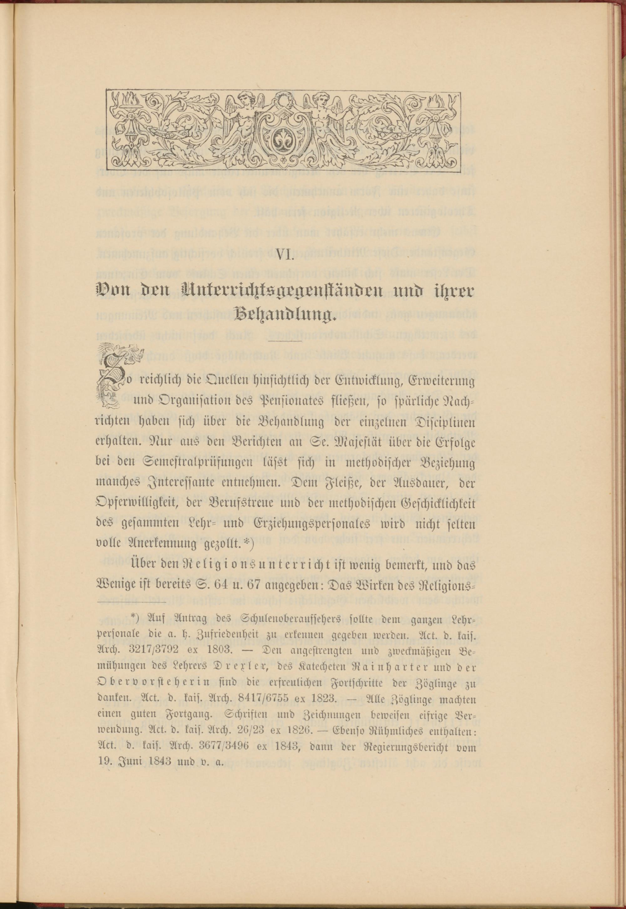 ^o reichlich die Quellen hinsichtlich der Entwicklung, Erweiterung und Organisation des Pensionates fließen, so spärliche Nach­richten haben sich über die Behandlung der einzelnen Disciplinen erhalten. Nur aus den Berichten an Se. Majestät über die Erfolge bei den Semestralprüfungen lässt sich in methodischer Beziehung manches Interessante entnehmen. Dem Fleiße, der Ausdauer, der Opserwilligkeit, der Berufstreue und der methodischen Geschicklichkeit des gesammten Lehr- und Erziehungspersonales wird nicht selten volle Anerkennung gezollt.*)