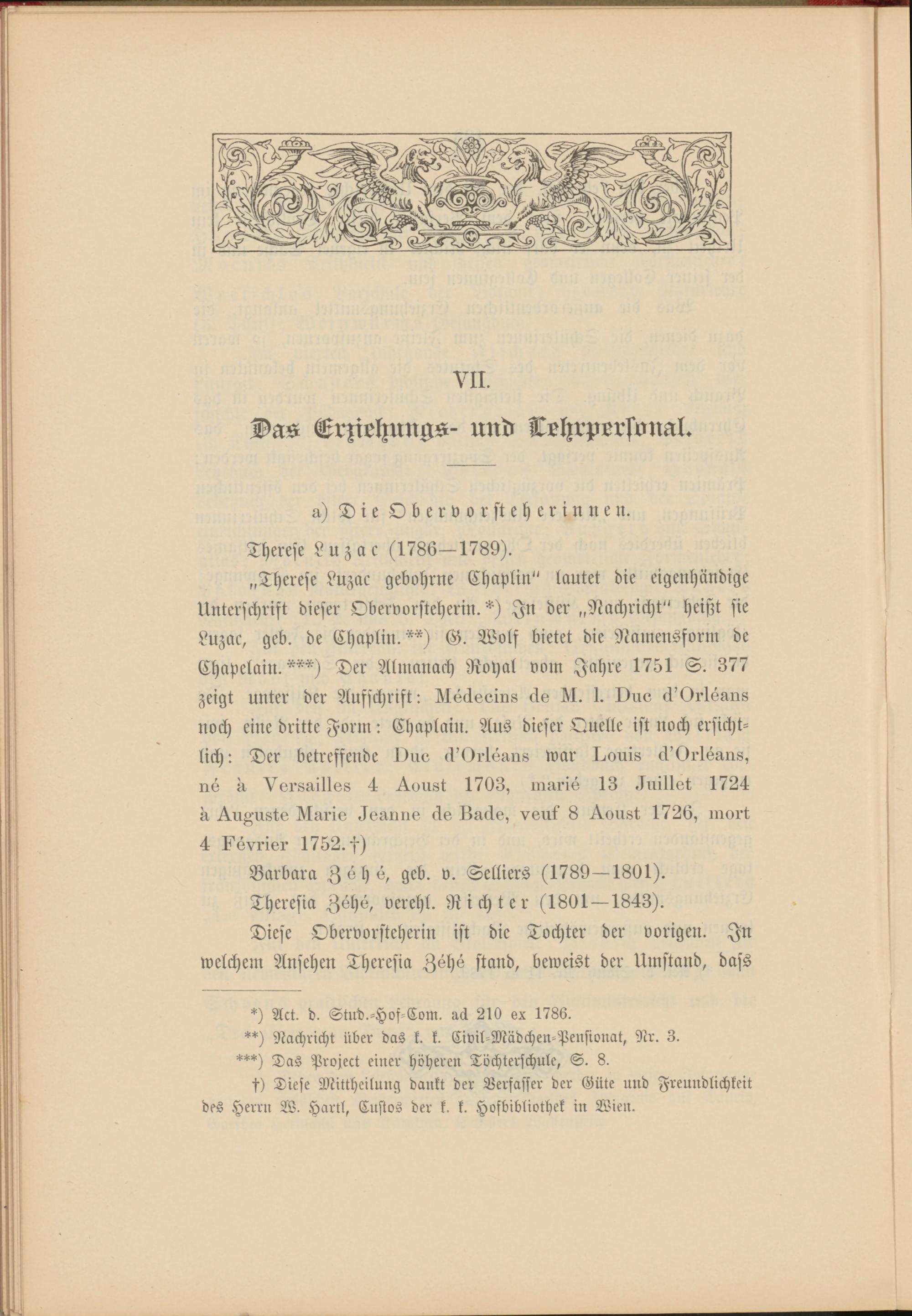 „Therese Luzac gebohrne Chaplin" lautet die eigenhändige Unterschrift dieser Obervorsteherin.* **) ***) ) In der „Nachricht" heißt sie Luzac, geb. de Chaplin."*) G. Wolf bietet die Namensform de Chapelain.""") Der Almanach Royal vom Jahre 1751 S. 377 zeigt unter der Aufschrift: iUücleoins cls iU. 1. I)ue (l'Orlsans noch eine dritte Form: Chaplain. Aus dieser Quelle ist noch ersichtlich: Der betreffende INm d'Orlvaus war I^ouis U'Orltzans, nä rr Versaillss 4 ^Lou8t 1703, Iiiaris 13 .luillet 1724 n ^.u^>u8t6 ^laiie 4oann6 Os Uacls, vent' 8 7Lou8t 1726, inort 4 l^vvriei' 1752. ch)