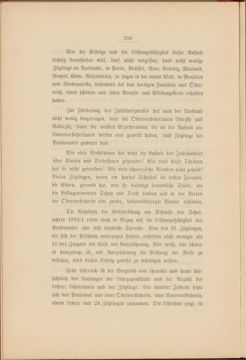Die Resultate der Reifeprüfung am Schlüsse des Schuljahres 1883/4 reden auch in Bezug auf die Leistungsfähigkeit des Pensionates eine sehr deutliche Sprache. Von den 31 Zöglingen, die sich der Prüfung unterzogen hatten, erhielten nicht weniger als 16 das Zeugnis der Reife mit Auszeichnung. Wer weiß, wie schwer es heutzutage ist, mit Auszeichnung die Prüfung der Reise zu bestehen, wird diesen Erfolg gewiss zu würdigen wissen.