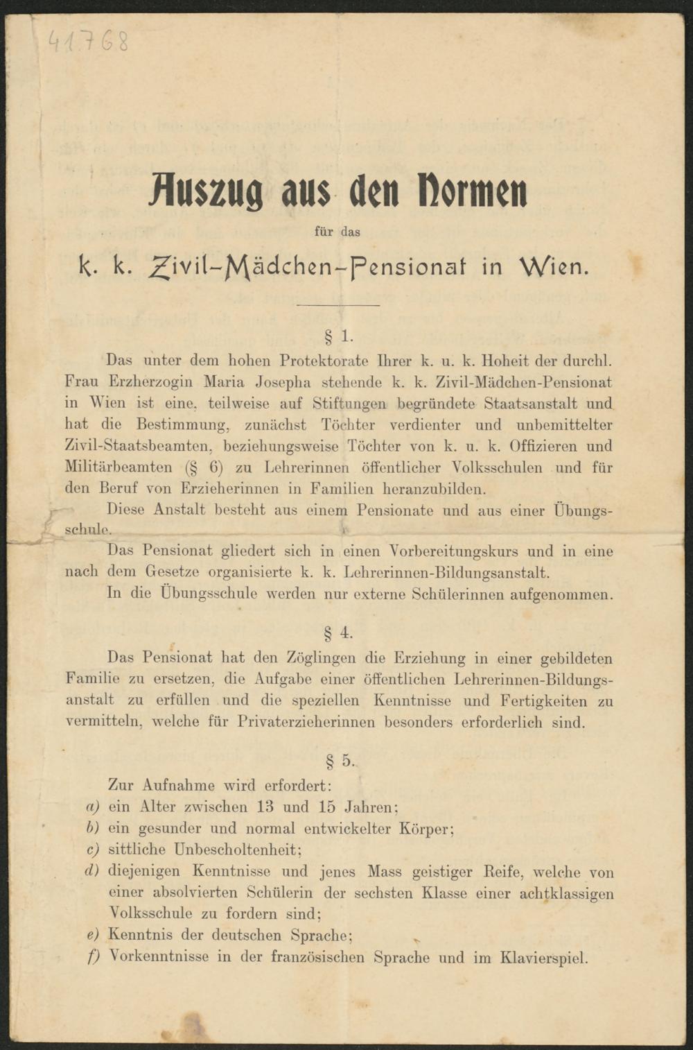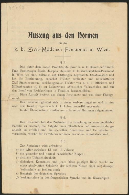 Da.8 unter dem trogen Protektorate tbrer b. u. k. Ilolreit der durebl. Lrau Lr^ber^ogin blaria do8eplra 8tolronde b. k. Zivi1-Näd6bon-Len8ionat in ^Vien i8t eine. teilwei86 aut 8tittungen begründete 8taat8an8ta1t und trat die Le8timmung, xunäelr8t Löebter verdienter und untreniittelter Zivil-8taat8beamten, be 2 iebung 8 W 6 i 86 Löebter von b. u. k. Otti^ieren und Nilitärbeamten 6) 2 iu Lebrerinnen öltentlieber Vo1b886bu1en und tür den Lernt von Lrmetrerinnen in Lamilien beranzubilden.