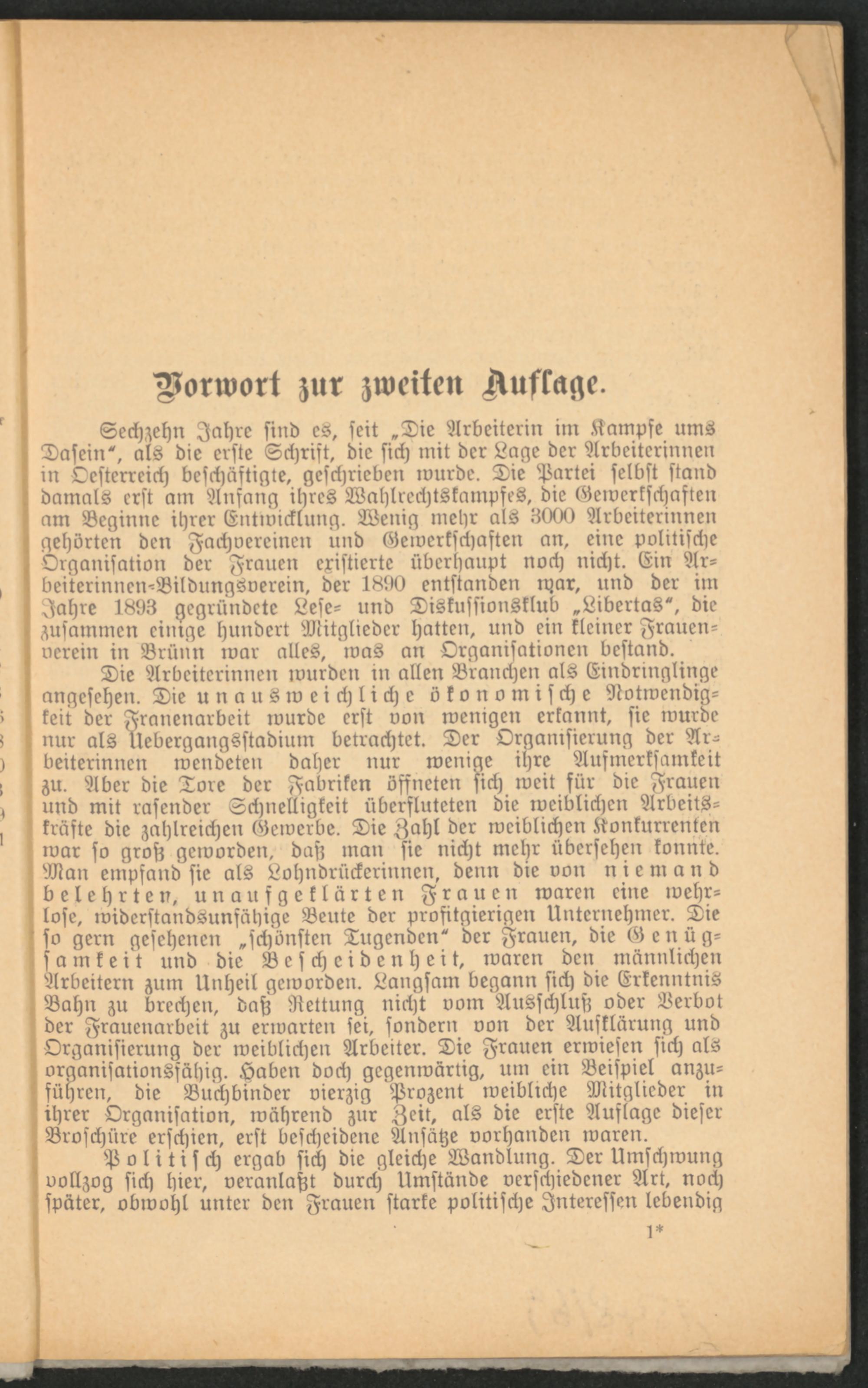 Sechzehn Jahre sind es, seit .Die Arbeiterin im Kampfe umS Dasein', al8 die erste Schrift, die sich mit der Lage der Arbeiterinnen in Oesterreich beschäftigte, geschrieben wurde. Die Partei selbst stand damals erst am Anfang ihres Wahlrcchtskampfes, die Gewerkschaften am Beginne ihrer Entwicklung. Wenig mehr als 3000 Arbeiterinnen gehörten den Fachvereinen und Gewerkschaften an, eine politische Organisation der Frauen existierte überhaupt noch nicht. Ein Ar- beiterinnen-Bildungsverein, der 1890 entstanden ipar, und der im Jahre 1893 gegründete Lese- und Diskussionsklub .Liberias', die zusammen cimge hundert Mitglieder hatten, und ein kleiner Frauen- ncrein in Brüiin war alles, was an Organisationen bestand.