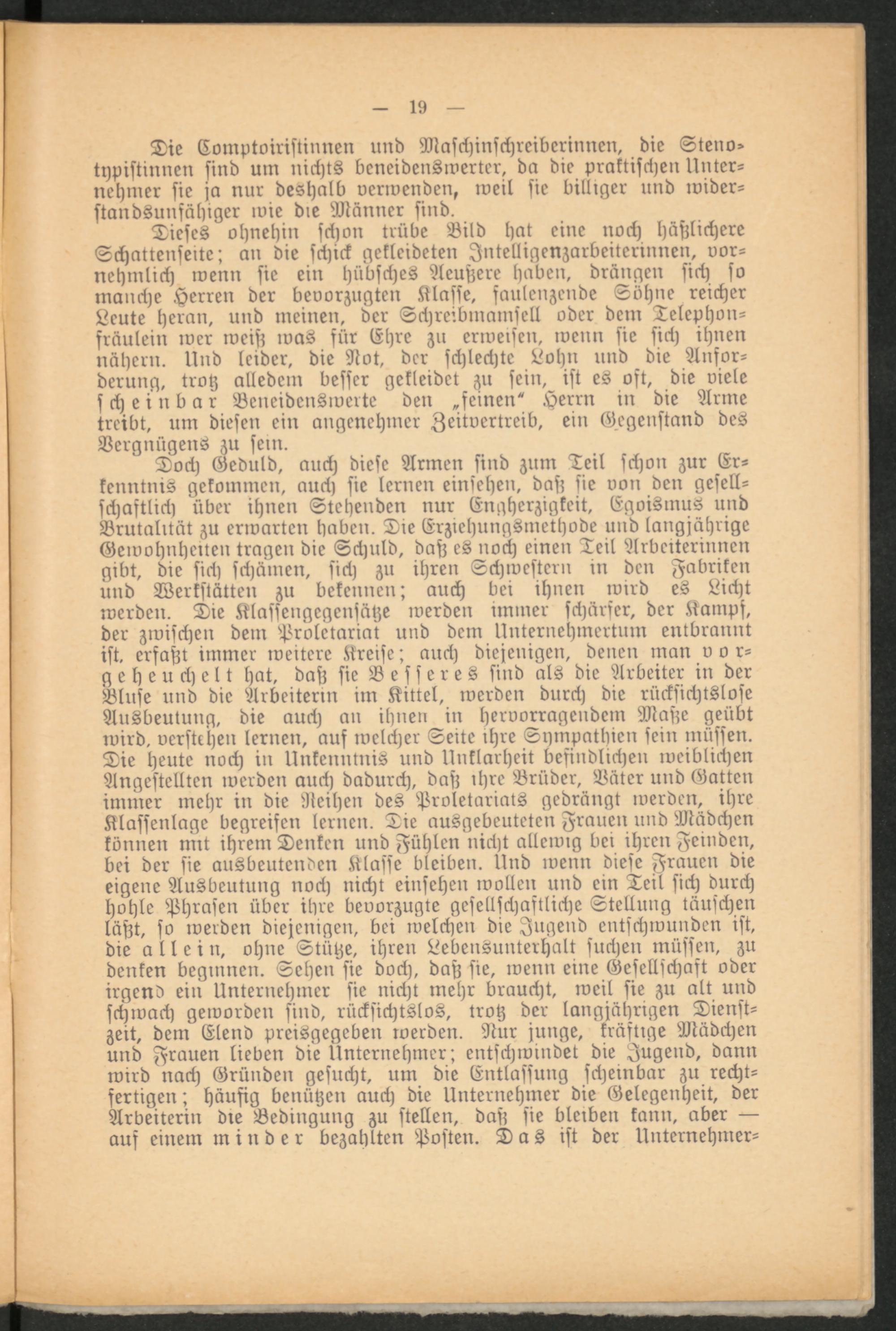 Die Comptoiristinnen und Maschinschreiberinnen, die Steno» ttzpistinnen sind um nichts beneidenswerter, da die praktischen Unternehmer sie ja nur deshalb verwenden, weil sie billiger und wider- standsunsähiger wie die Männer sind.