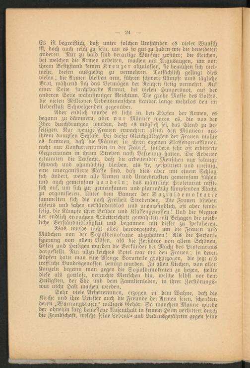 Was wurde nicht alles hervorgesucht, um die Frauen und Mädchen von der Sozialdemokratie abzuhalten! Als die Personifizierung von allem Bösen, als die Zerstörer von allem Schönen, Edlen und Heiligen wurden die Verkünder der Macht des Proletariats dargestellt. Nur allzu leichtes Spiel war mit den Frauen; in deren Köpfen hatte man eine Menge Vorurteile großgezogen, die jetzt als treffliche Bundesgenossen benützt wurden. In allen Kirchen, von allen Kanzeln begann man gegen d>e Sozialdemokraten zu hetzen, stellte diese als gottlose, verruchte Menschen hin, welche selbst vor dem Heiligsten, der Ebe und dem Familienleben, in ihrer Zerstörungswut nicht Halt machen werden.