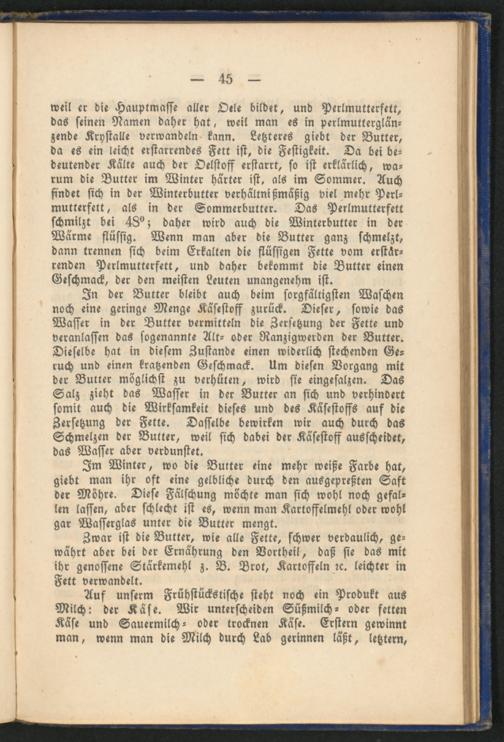 weil er die Hauptmasse aller Oele bildet, und Perlmutterfett, das seinen Namen daher hat, weil man es in perlmutterglän- zende Krystalle verwandeln kann. Letzteres giebt der Butter, da es ein leicht erstarrendes Fett ist, die Festigkeit. Da bei bedeutender Kälte auch der Oelstoff erstarrt, so ist erklärlich, warum die Butter im Winter härter ist, als im Sommer. Auch findet sich in der Winterbutter verhältnißmäßig viel mehr Perlmutterfett, als in der Sommerbutter. Das Perlmulterfett schmilzt bei 48°; daher wird auch die Winterbutter in der Wärme flüssig. Wenn man aber die Butter ganz schmelzt, dann trennen sich beim Erkalten die flüssigen Fette vom erstär- renden Perlmutterfett, und daher bekommt die Butter einen Geschmack, der den meisten Leuten unangenehm ist.