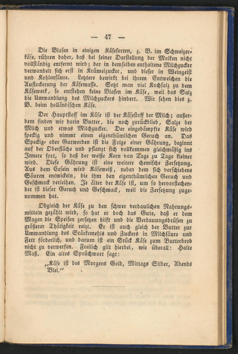 Die Blasen in einigen Käsesorten, z. B. im Schweizer- käse, rühren daher, daß bei seiner Darstellung der Molken nicht vollständig entfernt wird; der in demselben enthaltene Milchzucker verwandelt sich erst in Krümelzucker, und dieser in Weingeist und Kohlensäure. Letztere bewirkt bei ihrem Entweichen die Auflockerung der Käsemasse. Setzt man viel Kochsalz zu dem Käsewerk, so entstehen keine Blasen im Käse, weil das Salz die Umwandlung des Milchzuckers hindert. Wir sehen dies z. B. beim holländischen Käse.