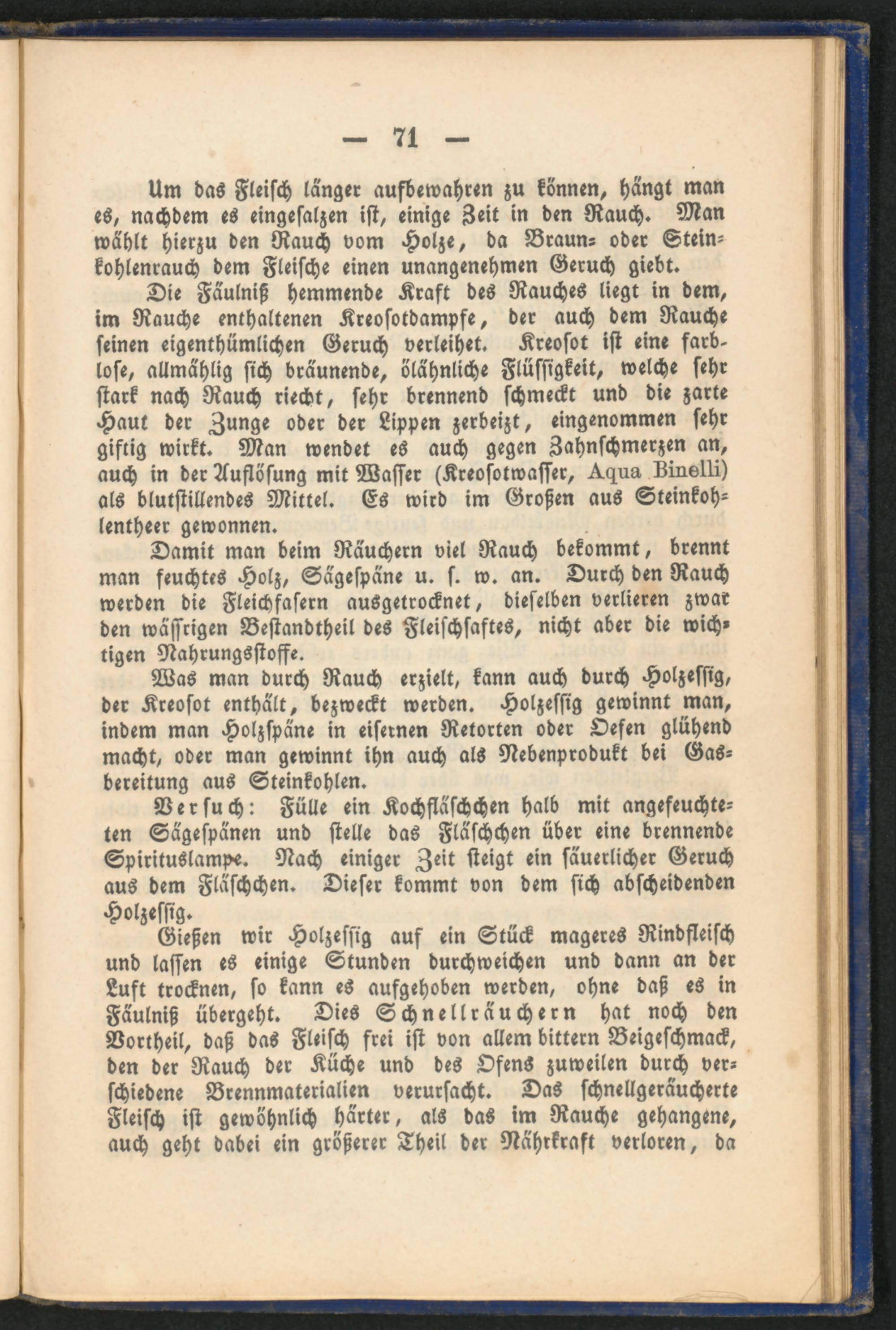 Was man durch Rauch erzielt, kann auch durch Holzessig, der Kreosot enthält, bezweckt werden. Holzessig gewinnt man, indem man Holzspäne in eisernen Retorten oder Oesen glühend macht, oder man gewinnt ihn auch als Nebenprodukt bei Gas­bereitung aus Steinkohlen.