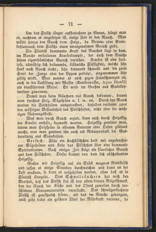 Damit man beim Räuchern viel Rauch bekommt, brennt man feuchtes Holz, Sägespäne u. s. w. an. Durch den Rauch werden die Fleichfasern ausgetrocknet, dieselben verlieren zwar den wässrigen Bestandtheil des Fleischsaftes, nicht aber die wich­tigen Nahrungsstoffe.
