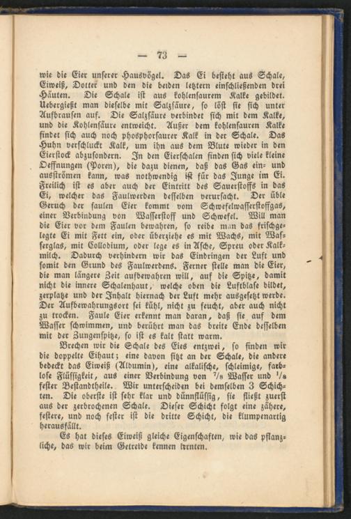 Brechen wir die Schale des Eies entzwei, so finden wir die doppelte Eihaut; eine davon sitzt an der Schalt, die andere bedeckt das Eiweiß (Albumin), eine alkalische, schleimige, farb­lose Flüssigkeit, aus einer Verbindung von Vs Wasser und V» fester Bestandtheile. Wir unterscheiden bei demselben 3 Schich­ten. Die oberste ist sehr klar und dünnflüssig, sie fließt zuerst aus der zerbrochenen Schale. Dieser Schicht folgt eine zähere, festere, und noch fester ist die dritte Schicht, die klumpenartig herausfällt.