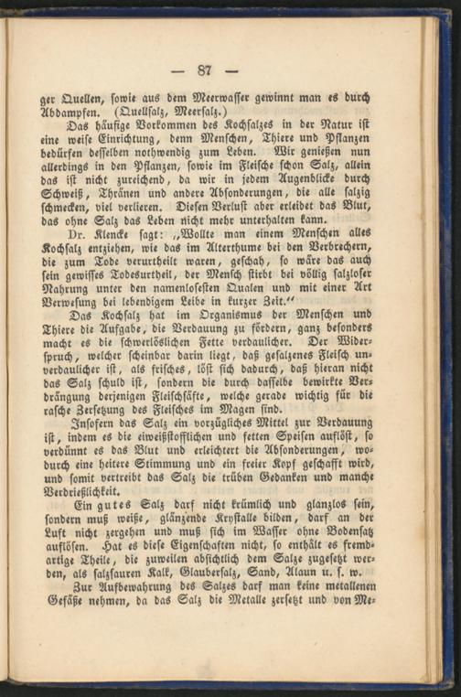 Dr. Klencke sagt: „Wollte man einem Menschen alles Kochsalz entziehen, wie das im Alterthume bei den Verbrechern, die zum Tode verurtheilt waren, geschah, so wäre das auch sein gewisses Todesurtheil, der Mensch stirbt bei völlig salzloser Nahrung unter den namenlosesten Qualen und mit einer Art Verwesung bei lebendigem Leibe in kurzer Zeit."