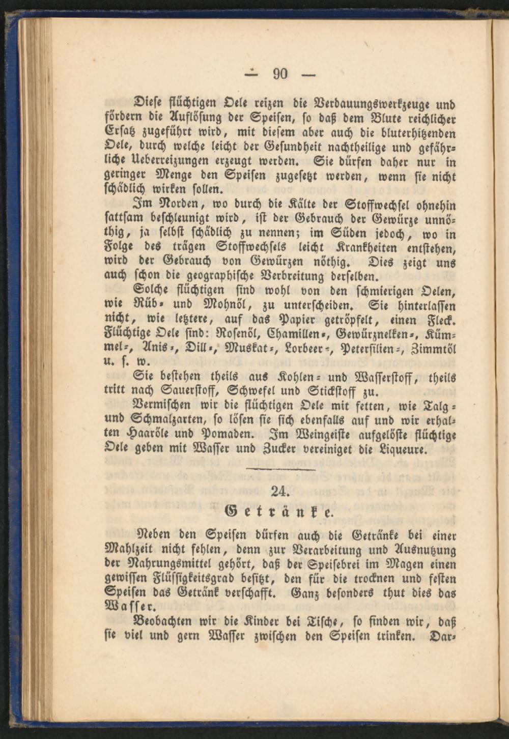 Solche flüchtigen sind wohl von den schmierigen Oelen, wie Rüb- und Mohnöl, zu unterscheiden. Sie hinterlassen nicht, wie letztere, auf das Papier getröpfelt, «inen Fleck. Flüchtige Oele sind: Rosenöl, Chamillen», Gewürznelken-, Kümmel-, Anis-, Dill-, Muskat-, Lorbeer-, Petersilien-, Zimmröl u. s. w.