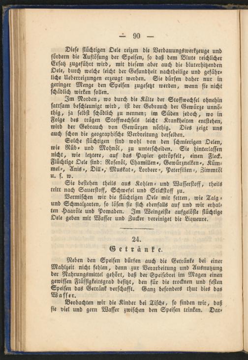 Neben den Speisen dürfen auch die Getränke bei einer Mahlzeit nicht fehlen, denn zur Verarbeitung und Ausnutzung der Nahrungsmittel gehört, daß der Speisebrei im Magen einen gewissen Flüssigkeitsgrad besitzt, den für die trocknen und festen Speisen das Getränk verschafft. Ganz besonders thut dies das Wasser.