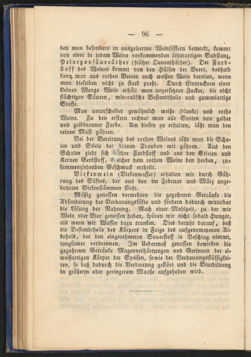 Mäßig genossen vermehren die gegohrnen Getränke die Absonderung der Verdauungssäfte und fördern dadurch mittelbar die Lösung der Nahrung. Nach einer Mahlzeit, zu der wir Wein oder Bier genossen haben, spüren wir nicht sobald Hunger, als wenn wir Wasser dazu tranken. Dies beruht darauf, daß die Bestandtheile des Körpers in Folge des aufgenommenen Alkohols, der den eingeathmeten Sauerstoff in Beschlag nimmt, langsamer verbrennen. Im Uebermaß genossen bewirken die gegohrnen Getränke Magenverhärtungen und Gerinnen der ei- weißartigen Körper der Speisen, sowie der Verdauungsflüssigkeiten. so daß dadurch die Verdauung gestört und die Blutbildung in großerm oder geringerem Maaße aufgehoben wird.