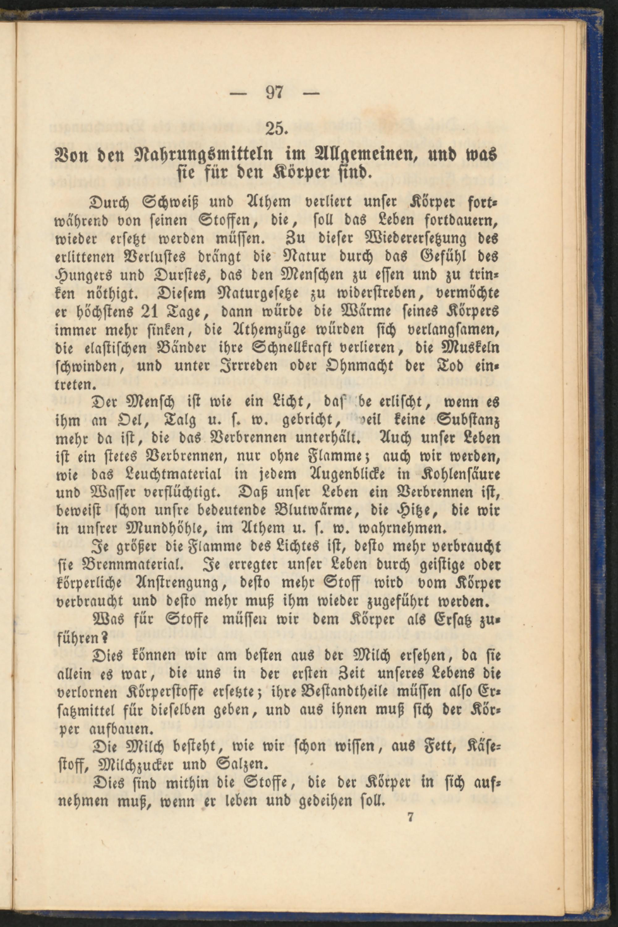 Durch Schweiß und Athem verliert unser Körper fortwährend von seinen Stoffen, die, soll das Leben fortdauern, wieder ersetzt werden müssen. Zu dieser Wiederersetzung des erlittenen Verlustes drängt die Natur durch das Gefühl des Hungers und Durstes, das den Menschen zu essen und zu trinken nöthigt. Diesem Naturgesetze zu widerstreben, vermöchte er höchstens 21 Tage, dann würde die Wärme seines Körpers immer mehr sinken, die Athemzüge würden sich verlangsamen, die elastischen Bänder ihre Schnellkraft verlieren, die Muskeln schwinden, und unter Jrrreden oder Ohnmacht der Tod eintreten.