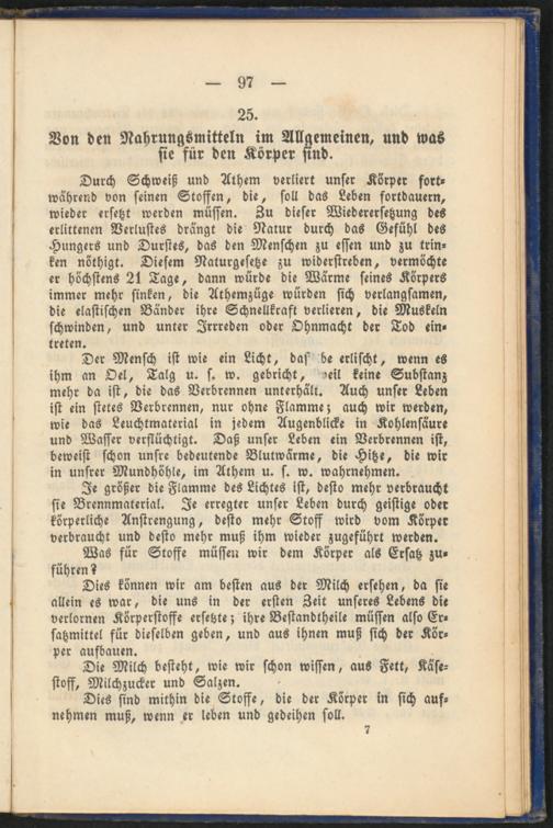 Der Mensch ist wie ein Licht, das be erlischt, wenn es ihm an Oel, Talg u. s. w. gebricht, ?eil keine Substanz mehr da ist, die das Verbrennen unterhält. Auch unser Leben ist ein stetes Verbrennen, nur ohne Flamme; auch wir werden, wie das Leuchtmaterial in jedem Augenblicke in Kohlensäure und Wasser verflüchtigt. Daß unser Leben ein Verbrennen ist, beweist schon unsre bedeutende Blutwärme, die Hitze, die wir in unsrer Mundhöhle, im Athem u. s. w. wahrnehmen.