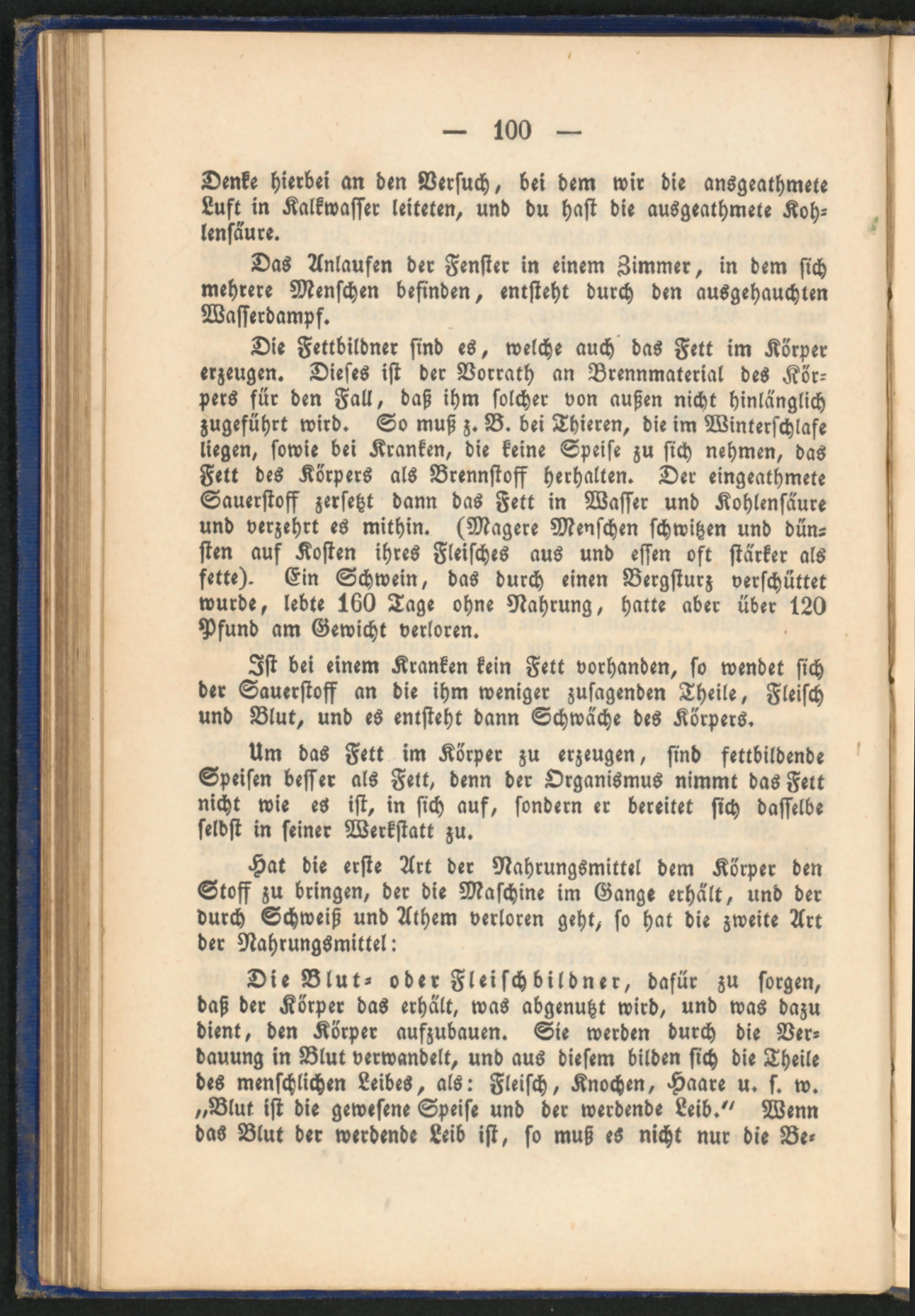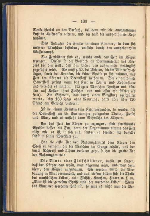 Die Fettbildner sind es, welche auch das Fett im Körper erzeugen. Dieses ist der Verrath an Brennmaterial des Kör­pers für den Fall, daß ihm solcher von außen nicht hinlänglich zugeführt wird. So muß z. B. bei Thieren, die im Winterschlafe liegen, sowie bei Kranken, die keine Speise zu sich nehmen, das Fett des Körpers als Brennstoff herhalten. Der eingeathmete Sauerstoff zersetzt dann das Fett in Wasser und Kohlensäure und verzehrt es mithin. (Magere Menschen schwitzen und dün­sten auf Kosten ihres Fleisches aus und essen oft stärker als fette). Ein Schwein, das durch einen Bergsturz verschüttet wurde, lebte 160 Tage ohne Nahrung, hatte aber über 120 Pfund am Gewicht verloren.