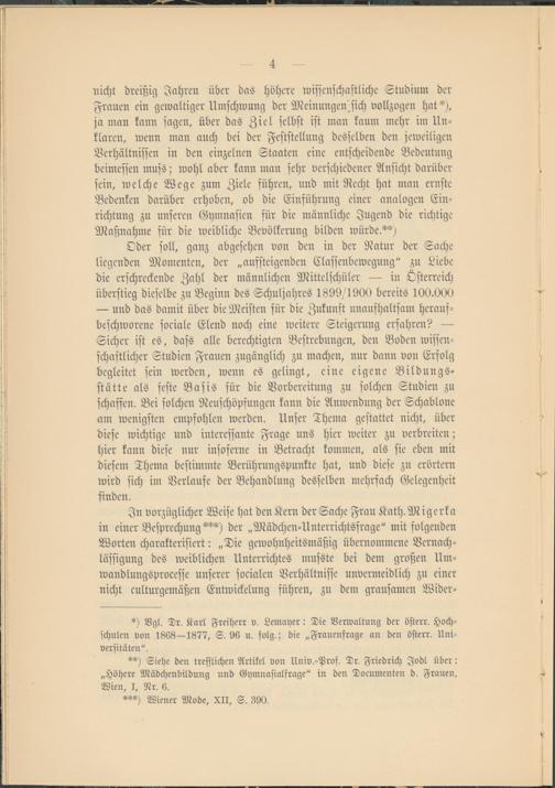 **) Siehe den trefflichen Artikel von Uuiv.-Prof. Dr. Friedrich Jodl über: Höhere Mädchenbildung und Gymnasialfrage" in den Documenten d. Frauen, Wien, I, Nr. 6.