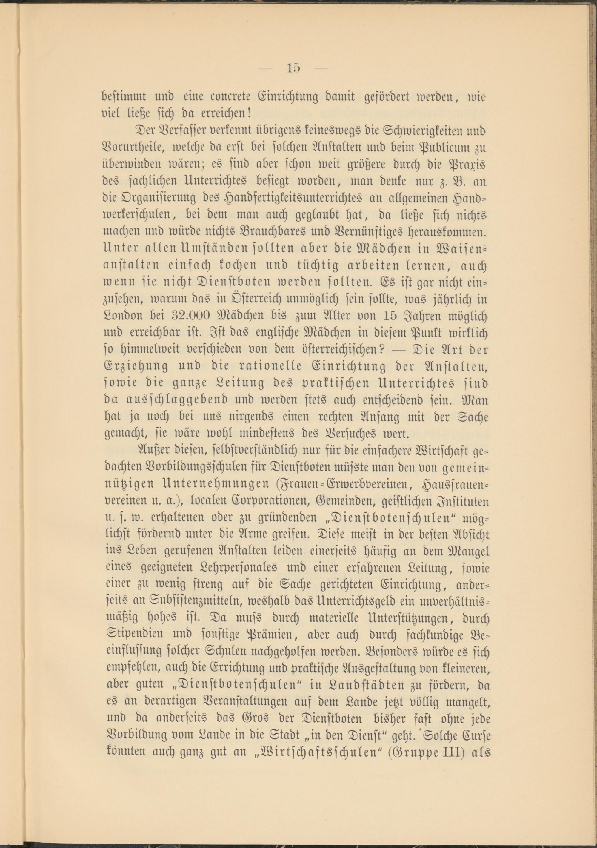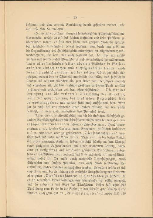 Der Verfasser verkennt übrigens keineswegs die Schwierigkeiten und Vorurtheile, welche da erst bei solchen Anstalten und beim Publicum zu überwinden wären; es sind aber schon weit größere durch die Praxis des sachlichen Unterrichtes besiegt worden, man denke nur z. B. an die Organisierung des Handfertigkeitsunterrichtes an allgemeinen Handwerkerschulen, bei dem man auch geglaubt hat, da ließe sich nichts machen und würde nichts Brauchbares und Vernünftiges herauskommen. Unter allen Umständen sollten aber die Mädchen in Waisen- anstalten einfach kochen und tüchtig arbeiten lernen, auch wenn sie nicht Dienstboten werden sollten. Es ist gar nicht einzusehen, warum das in Österreich unmöglich sein sollte, was jährlich in London bei 32.000 Mädchen bis zum Alter von 15 Jahren möglich und erreichbar ist. Ist das englische Mädchen in diesem Punkt wirklich so himmelweit verschieden von dem österreichischen? — Die Art der Erziehung und die rationelle Einrichtung der Anstalten, sowie die ganze Leitung des praktischen Unterrichtes sind da ausschlaggebend und werden stets auch entscheidend sein. Man hat ja noch bei uns nirgends einen rechten Ansang mit der Sache gemacht, sie wäre wohl mindestens des Versuches wert.