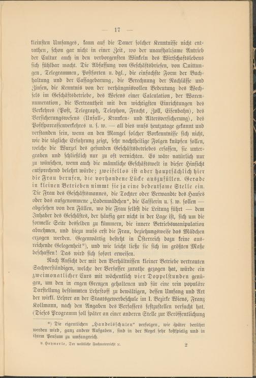 kleinsten Umfanges, kann auf die Dauer solcher Kenntnisse nicht ent- rathen, schon gar nicht in einer Zeit, wo der unaufhaltsame Antrieb der Cultur auch in den verborgensten Winkeln des Wirtschaftslebens sich fühlbar macht. Die Abfassung von Geschäftsbriefen, von Quittungen , Telegrammen, Postsorten u. dgl., die einfachste Form der Buchhaltung und der Cassagebarung, die Berechnung der Nachlässe und Zinsen, die Kenntnis von der verhängnisvollen Bedeutung des Wechsels im Geschäftsbetriebe, des Wesens einer Calculation, der Waren- numeration, die Vertrautheit mit den wichtigsten Einrichtungen des Verkehres (Post, Telegraph, Telephon, Fracht, Zoll, Eisenbahn), des Versicherungswesens (Unfall-, Kranken- und Altersversicherung), des Postsparcassenverkehres u. s. w. — all dies muss heutzutage gekannt und verstanden sein, wenn an den Mangel solcher Vorkenntnisse sich nicht, wie die tägliche Erfahrung zeigt, sehr nachteilige Folgen knüpfen sollen, welche die Wurzel des gesunden Geschäftsbetriebes erfassen, sie untergraben und schließlich nur zu oft vernichten. Es wäre natürlich nur zu wünschen, wenn auch die männliche Geschäftswelt in dieser Hinsicht entsprechend belehrt würde; zweifellos ist aber hauptsächlich hier die Frau berufen, die vorhandene Lücke auszufüllen. Gerade in kleinen Betrieben nimmt sie ja eine bedeutsame Stelle ein. Die Frau des Geschäftsmannes, die Tochter oder Verwandte des Hauses oder das aufgenommene „Ladenmädchen", die Cassierin u. s. w. sollen — abgesehen von den Fällen, wo die Frau selbst die Leitung führt — dem Inhaber des Geschäftes, der häufig gar nicht in der Lage ist, sich um die formelle Seite desselben zu kümmern, die innere Betriebsmanipulation abnehmen, und hiezu muss erst die Frau, beziehungsweise das Mädchen erzogen werden. Gegenwärtig besteht in Österreich dazu keine ausreichende Gelegenheit "), und wie leicht ließe sie sich im größten Maße beschaffen! Das wird sich sofort erweisen.
