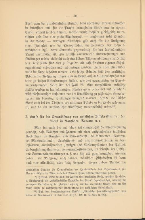 Theil zwar der grundsätzlichen Ansicht, dass überhaupt fremde Sprachen in intensiver und für die Praxis brauchbarer Weise nur in eigenen Eursen erlernt werden können, welche wenig Schüler gleichzeitig unterrichten und über eine große Stundenzahl — mindestens sechs Stunden in der Woche — verfügen. Ähnliches gilt auch für die Aneignung einer Fertigkeit wie der Stenographie, im Gebrauche der Schreibmaschine u. dgl., deren Kenntnis gegenwärtig für den kaufmännischen Dienst unerlässlich ist. Für gewisse commercielle Unternehmungen und Stellungen würde vielleicht auch eine höhere Allgemeinbildung erforderlich sein; diese Fälle sind aber zu singulär, als dass sie einen eigenen Schul- organismus erheischen und rechtfertigen würden. Unter allen Umständen muss im Auge behalten werden, dass solche Schulen stets dem praktischen Bedürfnisse Rechnung tragen und in Bezug aus das Unterrichtshonorar keine zu hohen Anforderungen stellen, wie dies gegenwärtig an Privat- unternehmungen dieser Art der Fall ist. Gut vorgebildete weibliche Kräfte werden in kaufmännischen Kreisen gerne verwendet und gesucht.*) Nichtsdestoweniger muss man vor der Ausbildung zu zahlreicher Bewerberinnen für derartige Stellungen dringend warnen, gerade weil dieser Beruf auch bei den Töchtern der mittleren Stände in die Mode gekommen ist, und da ein empfindlicher Rückschlag unvermeidlich wäre.**)