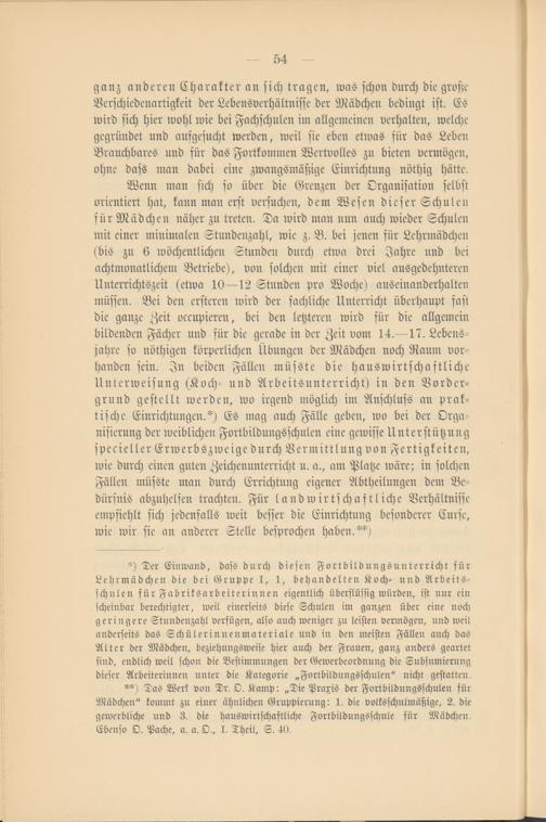 **) Das Werk von Dr. O. Kamp: „Die Praxis der Fortbildungsschulen für Mädchen" kommt zu einer ähnlichen Gruppierung: 1. die volksschulmüßige, 2. die gewerbliche und 3. die hauswirtschaftliche Fortbildungsschule für Mädchen. Ebenso O. Pache, a. a. O., I. Theil, S. 40.